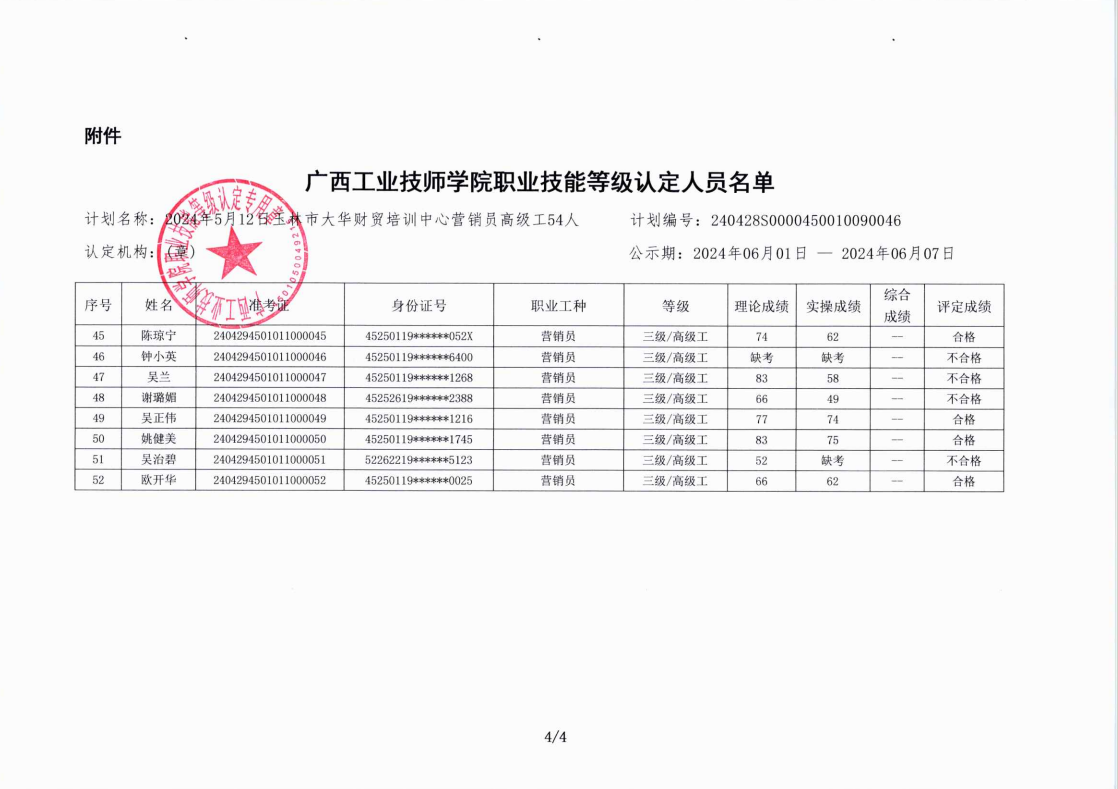 广西工业技师学院职业技能等级认定人员成绩公示(2024年5月12日玉林市大华财贸培训中心营销员高级工54人)