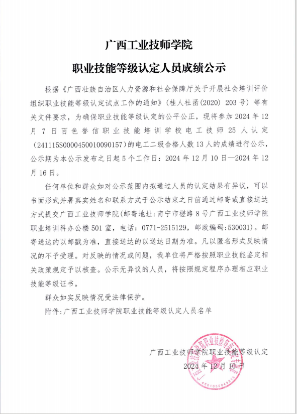 广西工业技师学院职业技能等级认定人员成绩公示(12.07百色誉信职业技能培训学校电工技师25人)