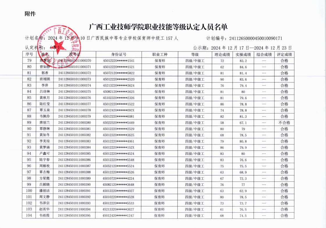 广西工业技师学院职业技能等级认定人员成绩公示(12.9-10广西民族中等专业学校保育师中级认定)