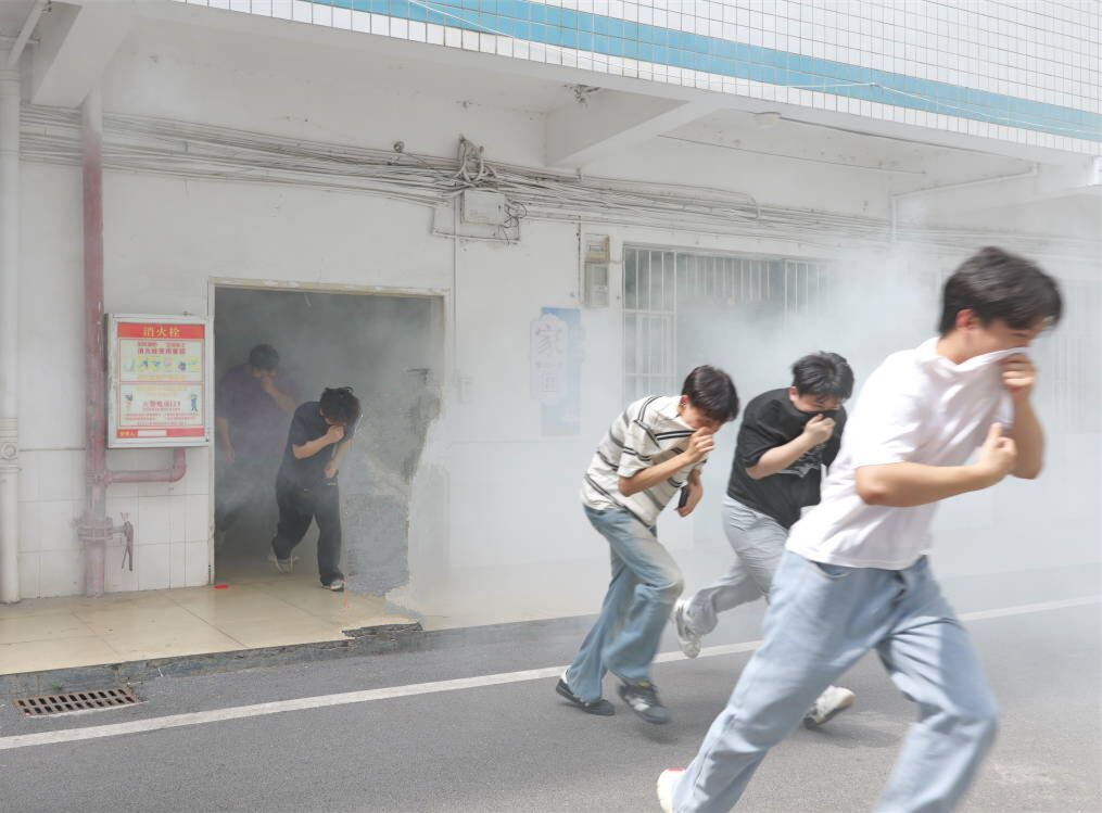 14:30-16:00,应急疏散演练正式启动。演练模拟火灾/地震场景,随着紧急广播响起,“同学们,请注意:学生八栋宿舍发生紧急灾害事故……请1、2、4、6 楼的同学开始往下疏散”“请 3、5、7 楼的同学开始往下疏散”,疏散工作有序展开。