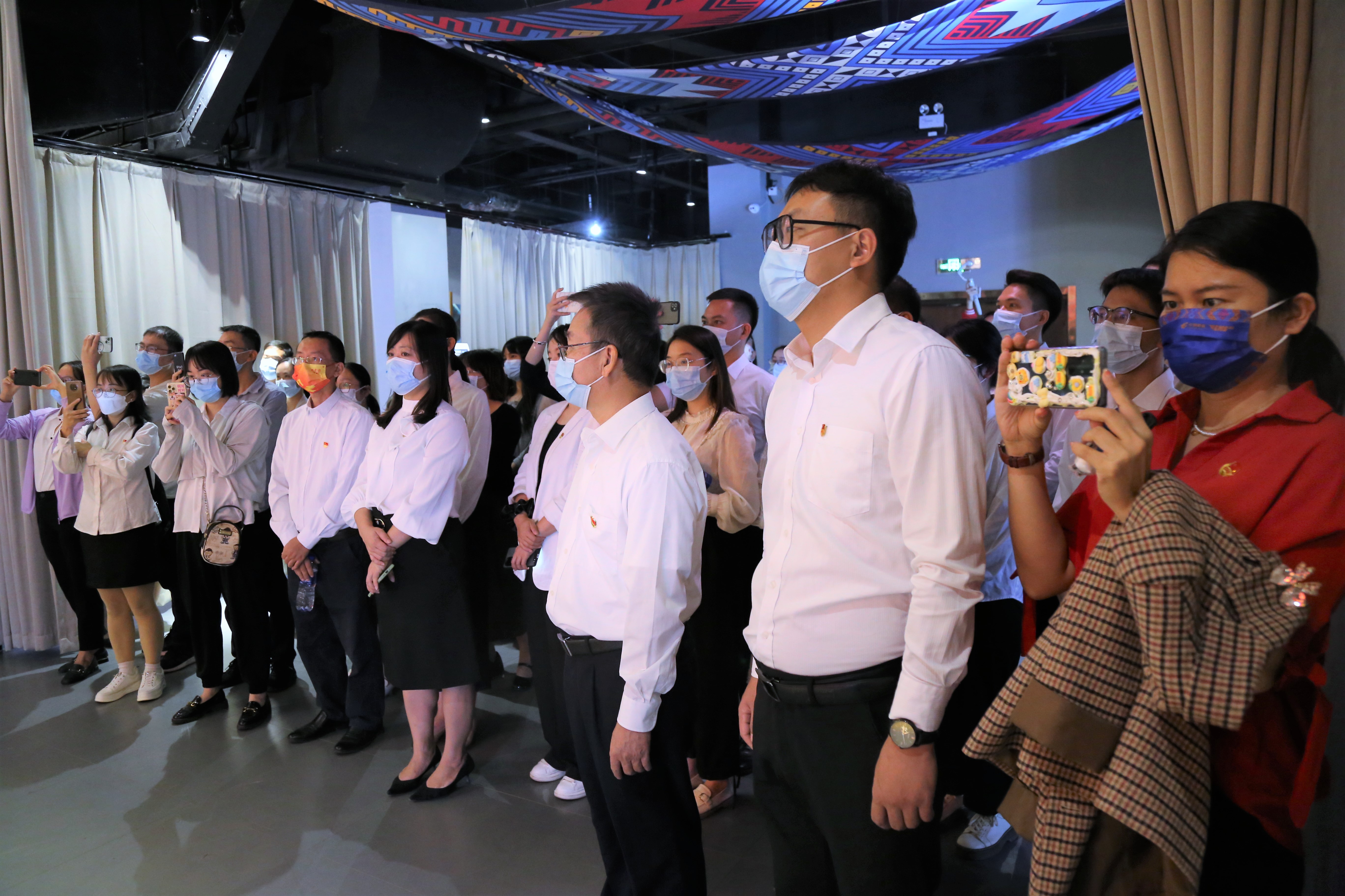 大家先后参观了电影党校先进人物墙、中国共产党人的精神谱系电影合辑、“‘爱南宁 爱电影’朱槿花厅百位电影人拼图”“红船启航”“看电影学党史”“电影时光隧道”等富有教育意义的特色主题场景。这些场景通过中国红色电影的历史变迁和发展,将中国共产党党史和中国电影史、民族团结进步、中国精神等完美地融合在一起,再通过讲解员对建党百年来关键节点大事件的回顾和解析,让大家体验到了一场“沉浸式”党史学习教育。