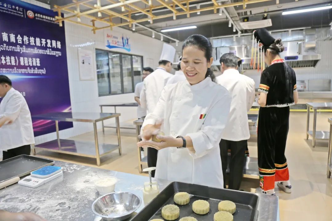 随着开班仪式的圆满落幕,一场别开生面的文化交流盛宴随即拉开序幕。党委书记、院长莫创才,副院长龙长华以及技艺精湛的烹饪实训教师们,与远道而来的老挝官员及教师们欢聚一堂,共同沉浸于月饼制作的温馨时光之中。