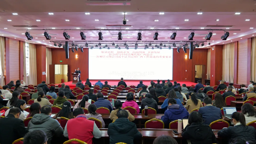 2025年1月9日下午,自治区决策咨询委员会咨询专家、自治区人民政府参事黄健受邀莅临我院,为全院教职工带来题为《解放思想、创新求变,向海图强、开放发展,奋力谱写中国式现代化广西篇章——深刻领会贯彻落实习近平总书记对广西工作论述的重要要求》的专题培训。