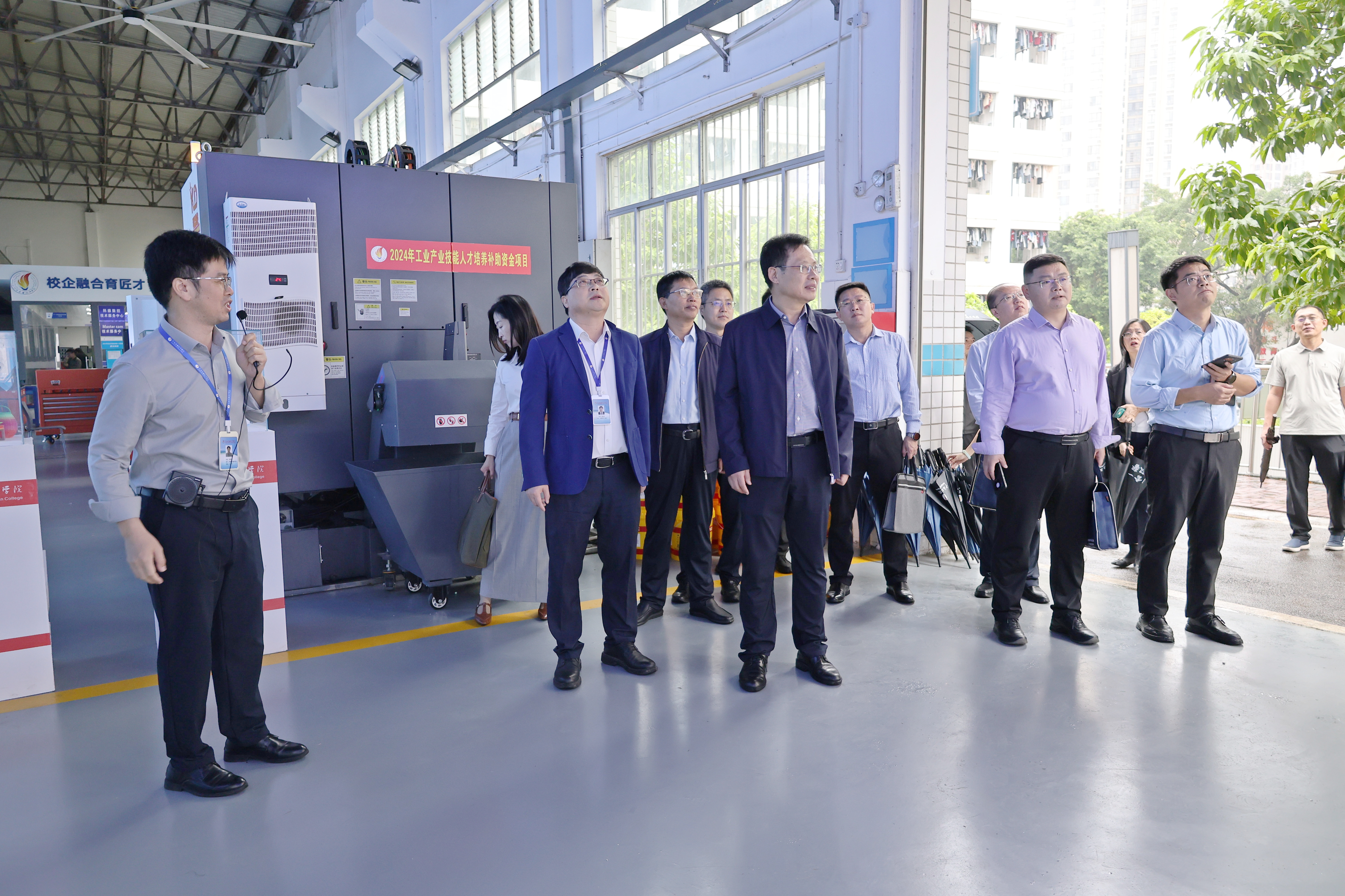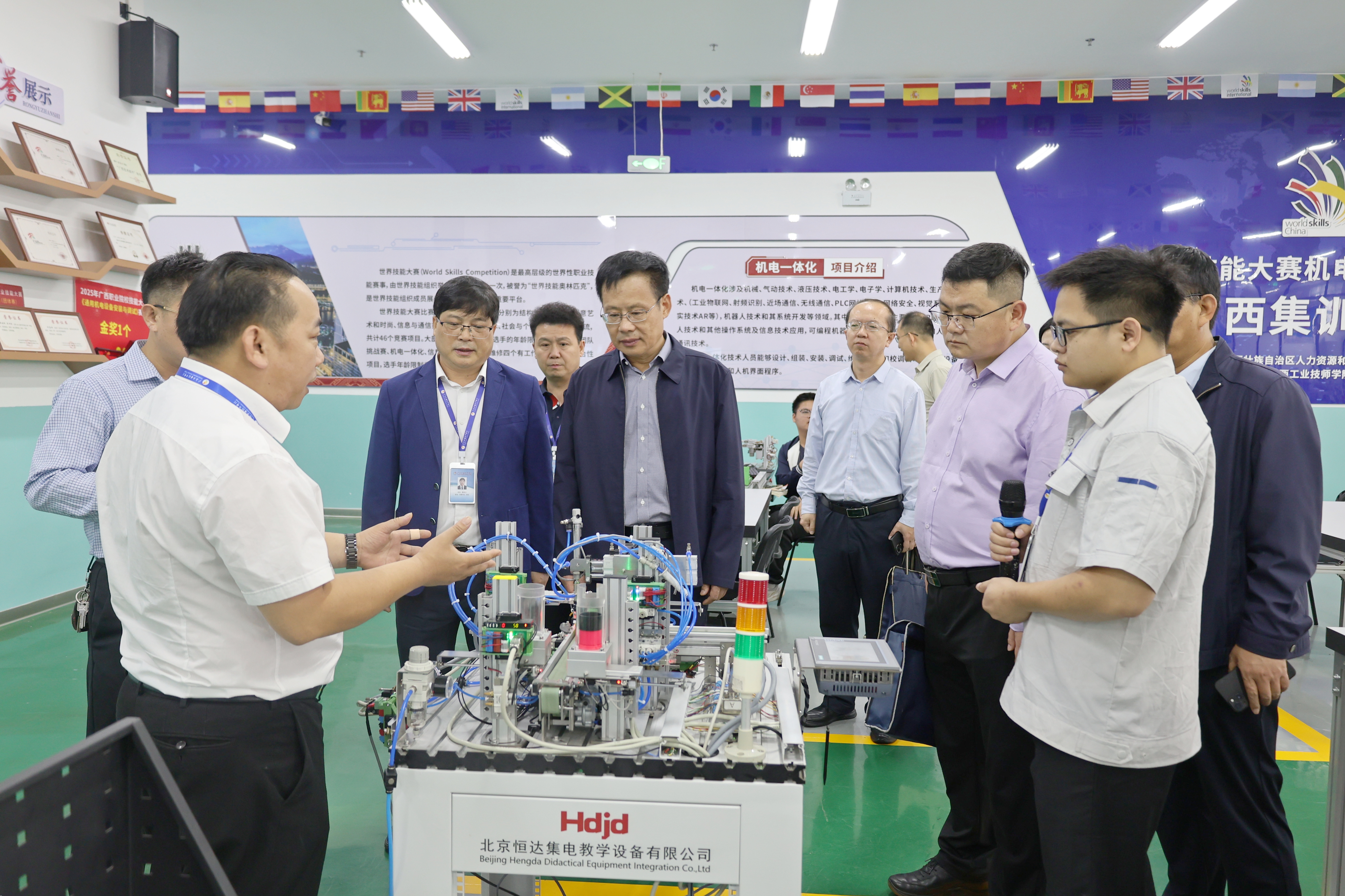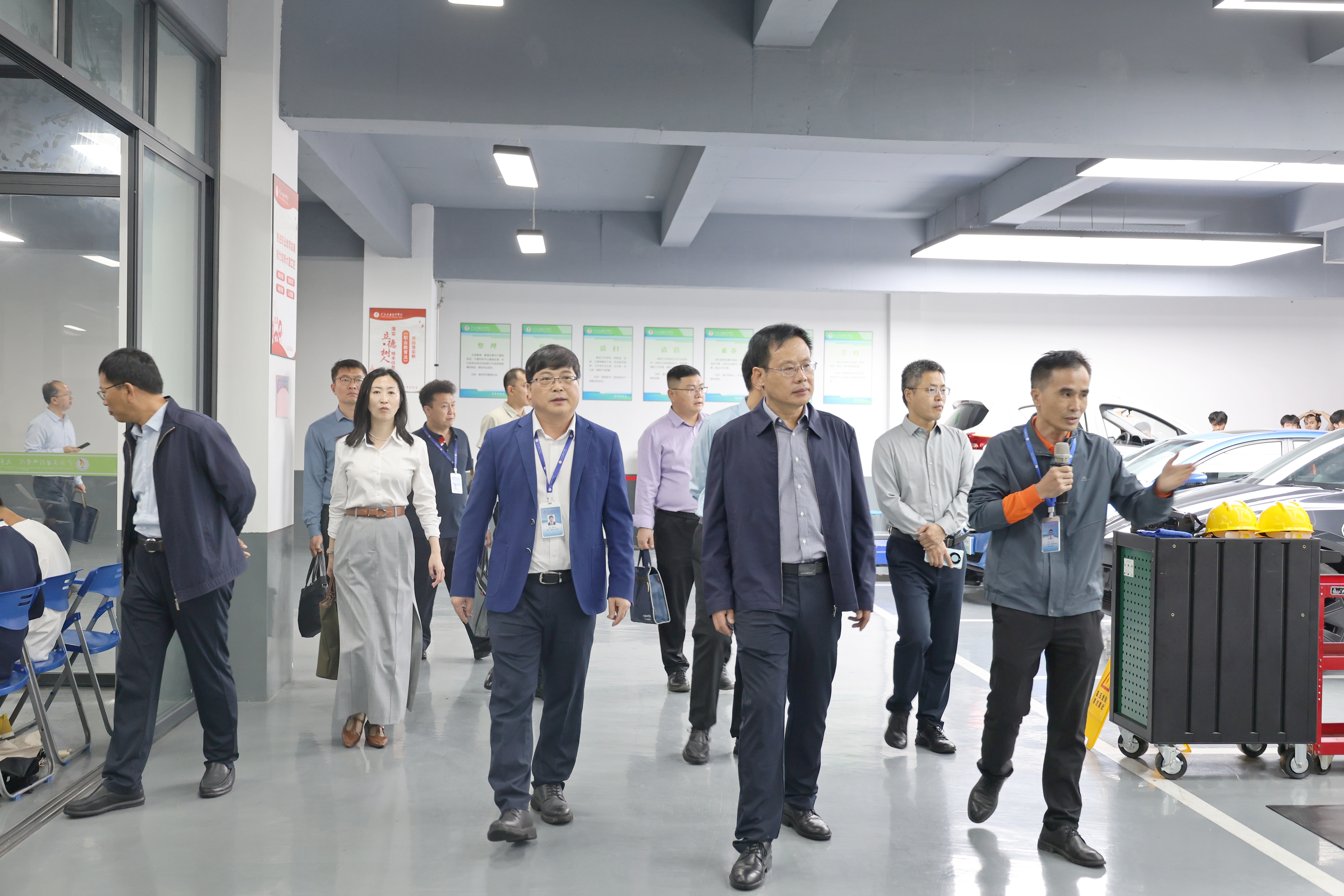 崔相国一行在广西工业技师学院领导的陪同下,参观了智能制造、机电一体化、汽车检测与维修等实训场地,深入了解了实训课程设计、工学一体化教学实施情况,并就实训基地建设、产教融合措施进行了交流探讨。
