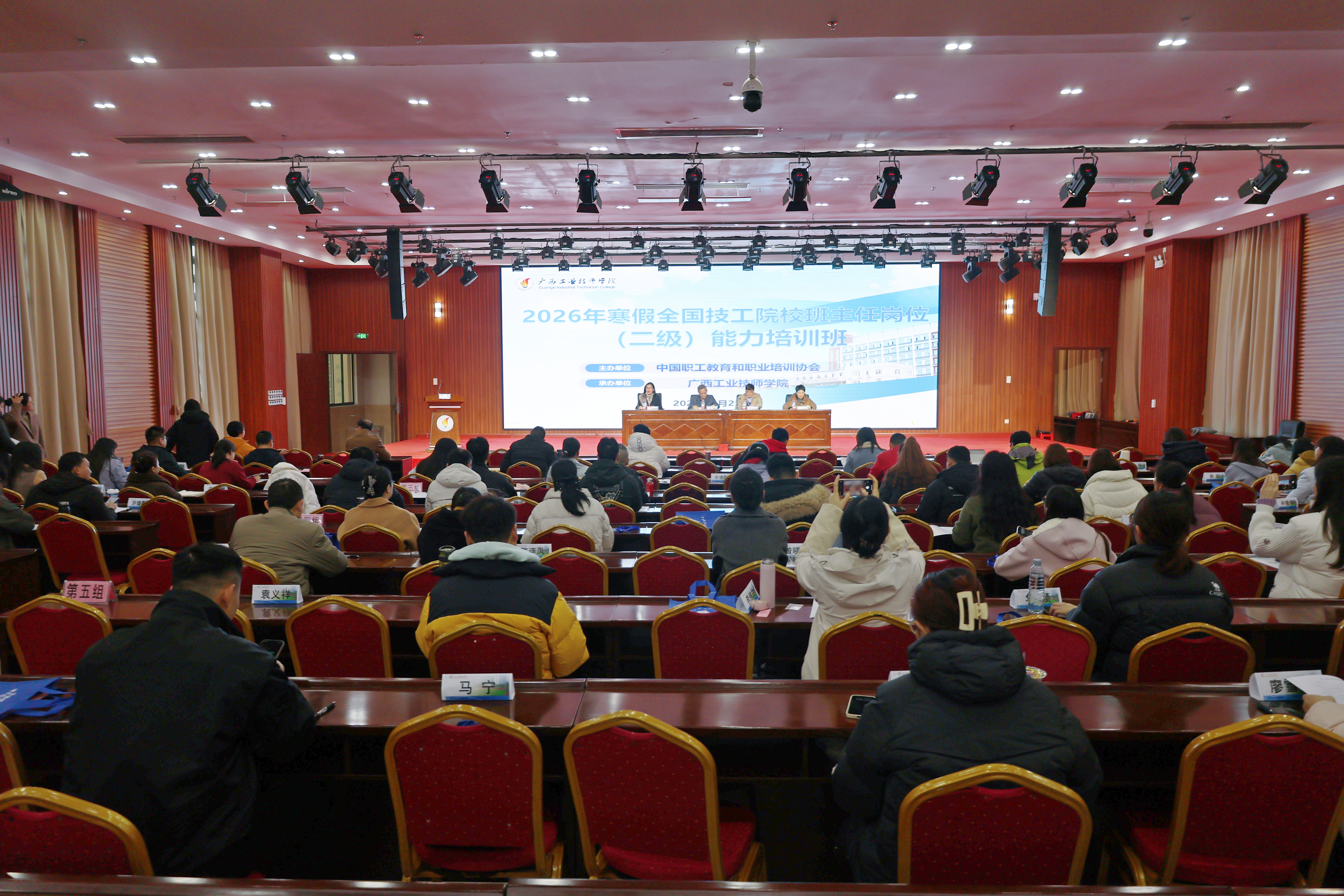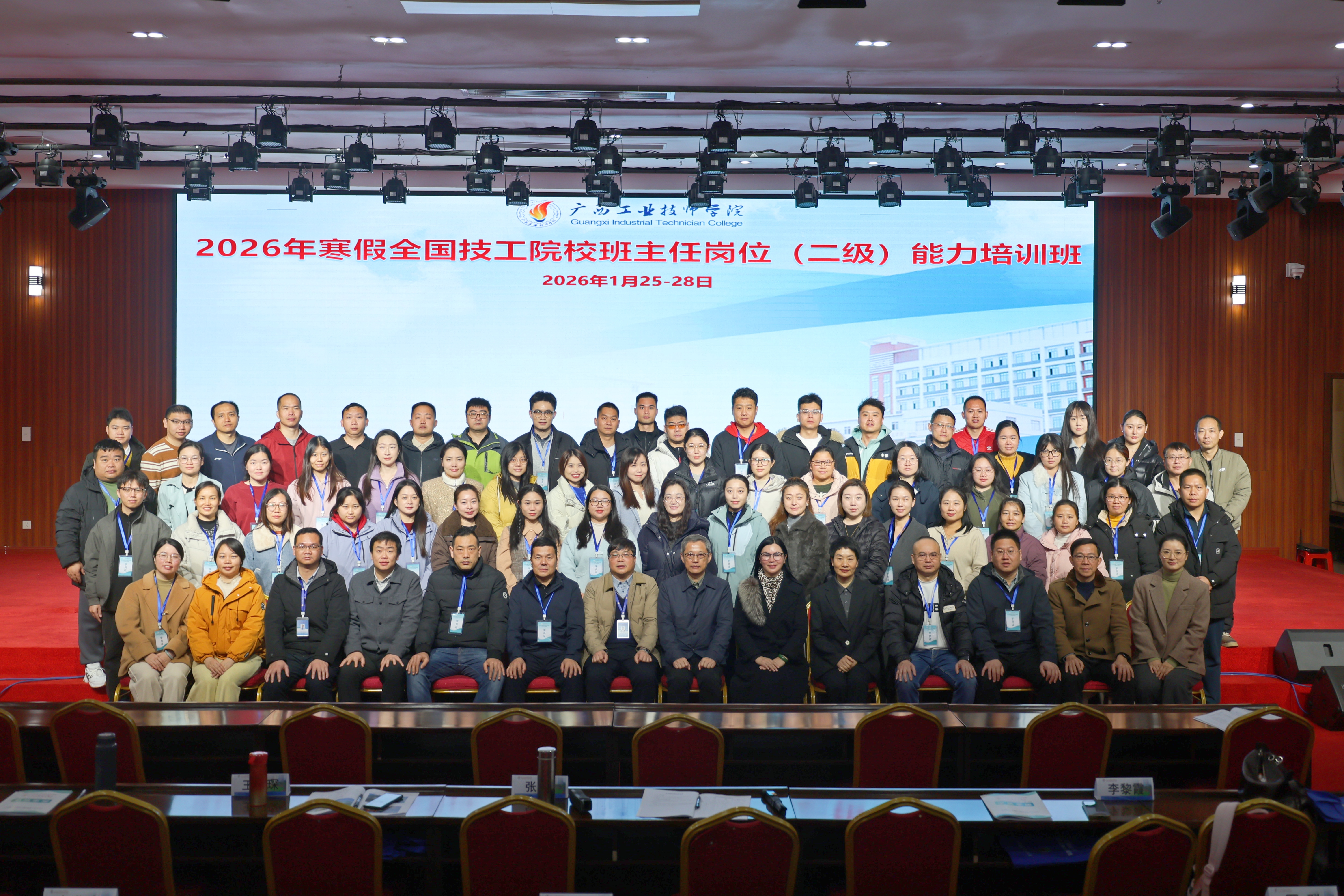 2026年1月25日上午,全国技工院校班主任岗位(二级)能力培训班在南宁顺利开班。本次培训由中国职工教育和职业培训协会主办、广西工业技师学院承办,来自广东、河北、江西、广西4省11所技工院校的62名班主任及管理干部齐聚邕城。中国职工教育和职业培训协会学术委员会委员吴静,广西工业技师学院党委书记、院长莫创才,江苏省盐城技师学院党委委员、副院长郑海风出席开班仪式,仪式由广西工业技师学院党委委员、副院长王晓萍主持。