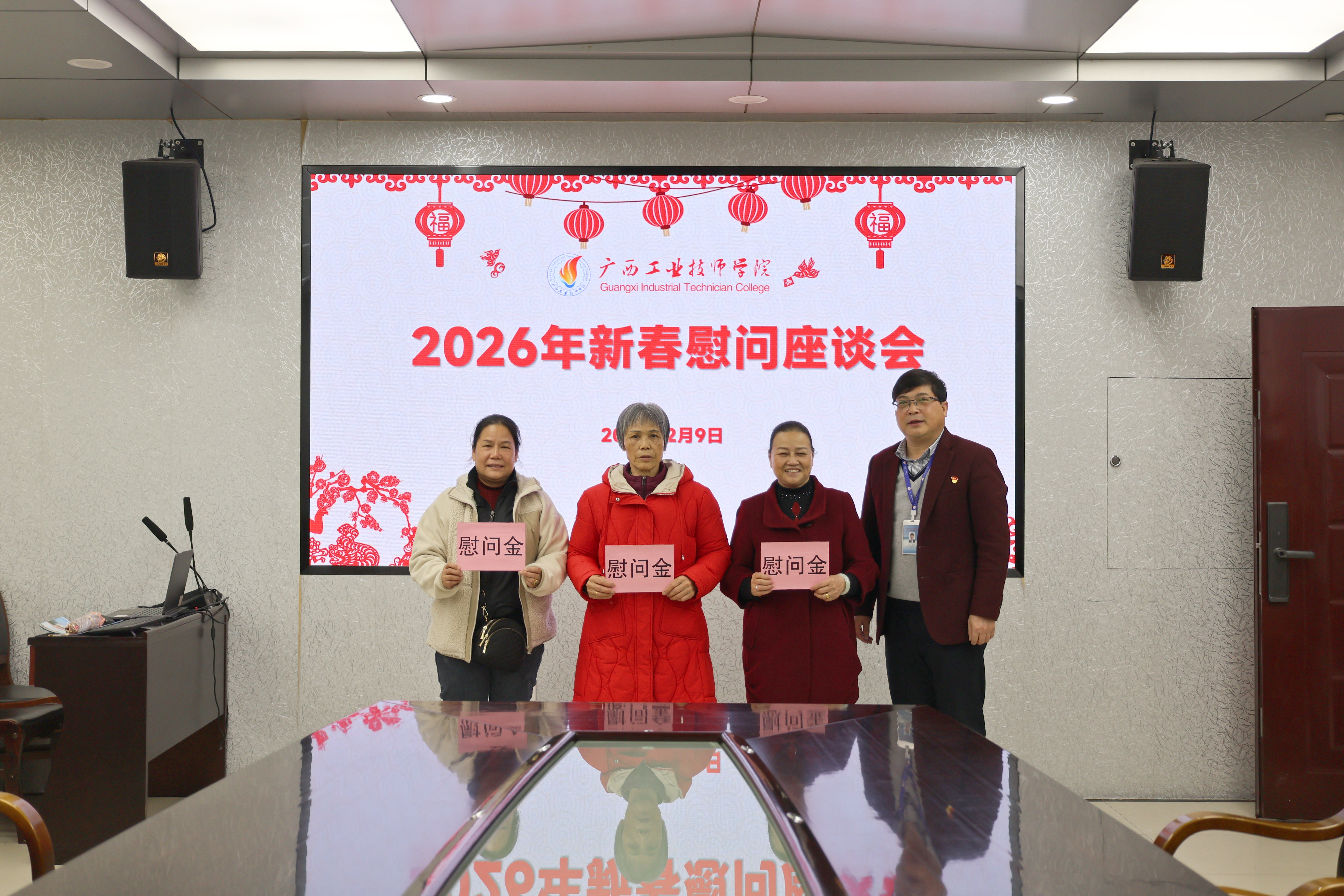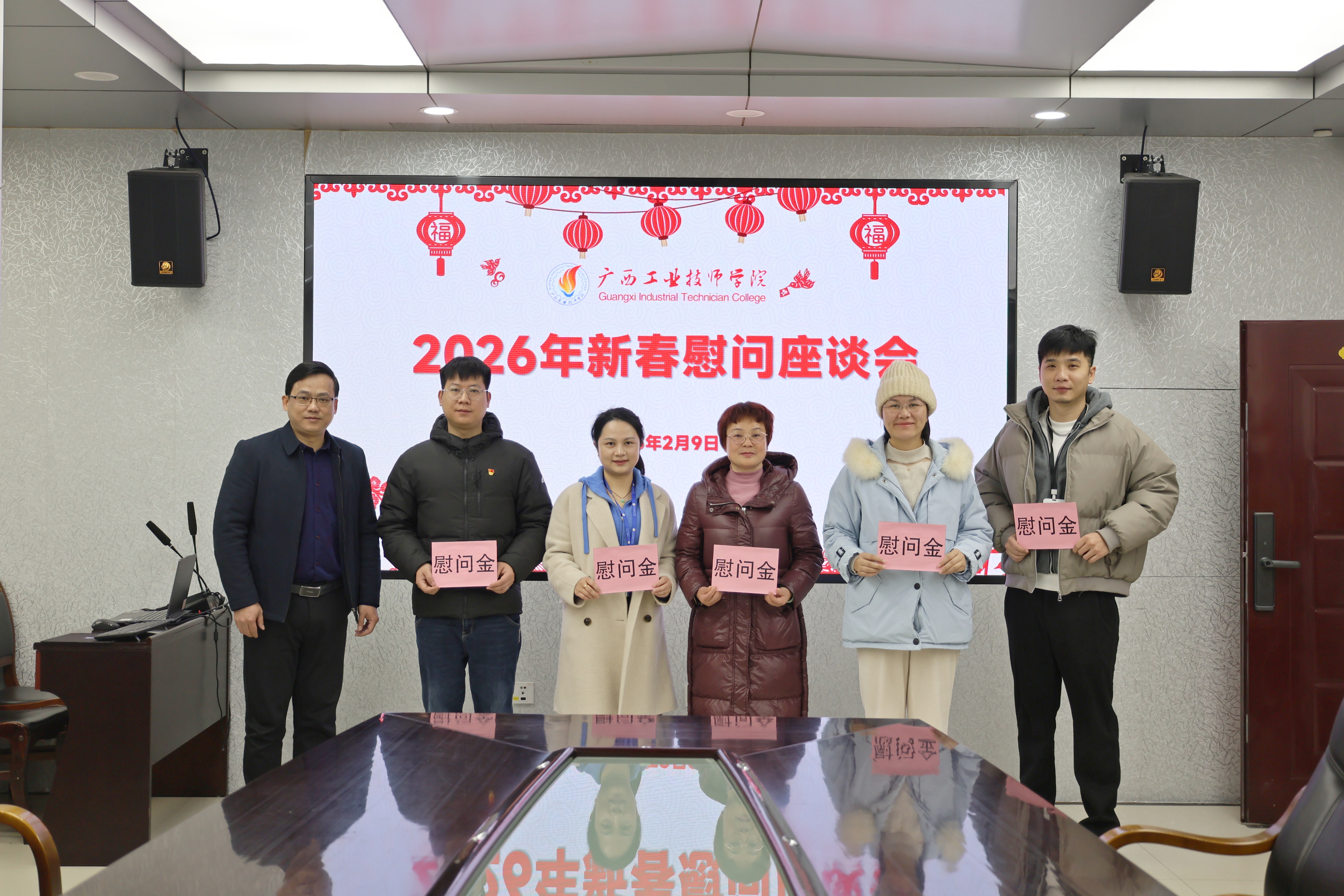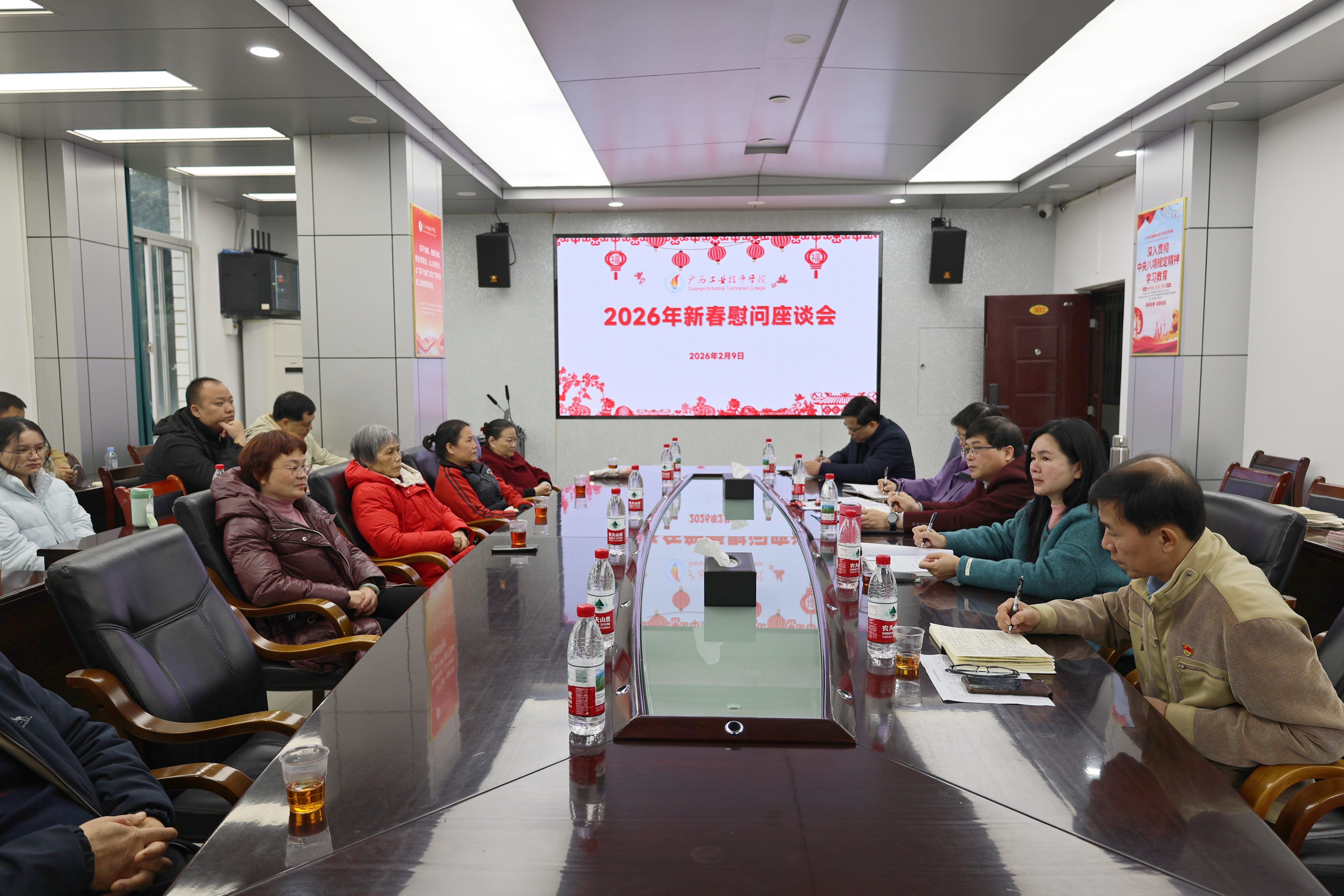 新春将至,暖意先行。为让全体教职工在岁末年初感受到学院大家庭的关怀与温暖,2026年2月9日,广西工业技师学院精心组织新春慰问座谈会暨春节前夕走访慰问活动。广西工业技师学院党委书记、院长莫创才,党委副书记、纪委书记雷敏,党委委员、副院长王晓萍,党委委员、副院长黄海,党委委员、工会副主席卢智伟参与活动。