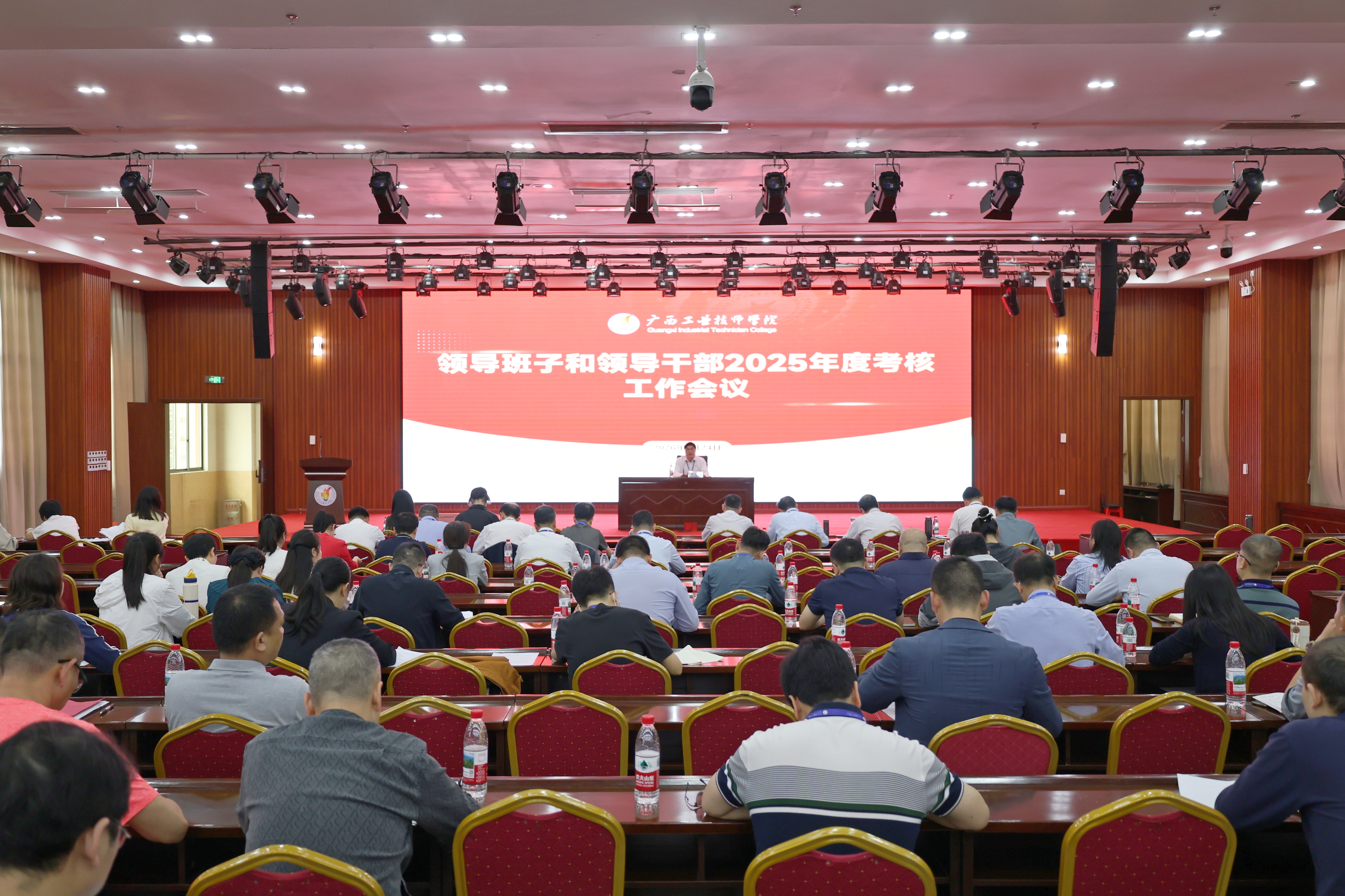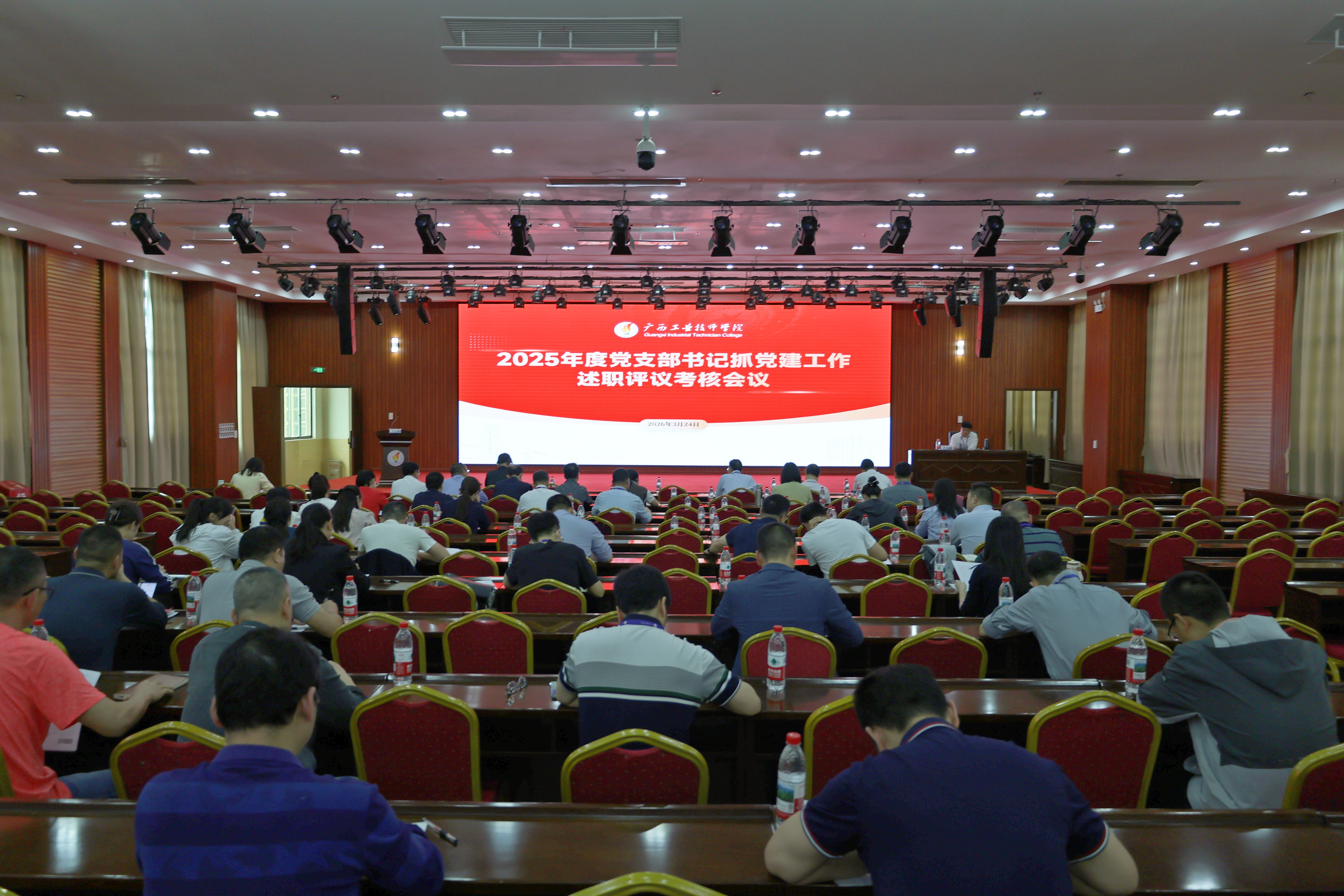 2026年3月24日下午,广西工业技师学院组织召开2025年度学院领导班子和领导干部考核工作会议,全面总结年度工作、查摆问题不足、明确改进方向,以高质量党建引领学院事业高质量发展。广西工业技师学院领导班子、中层以上干部、副高级及以上职称专技人员参加会议。自治区工业和信息化厅人事处一级主任科员韦付才到会指导考核工作。