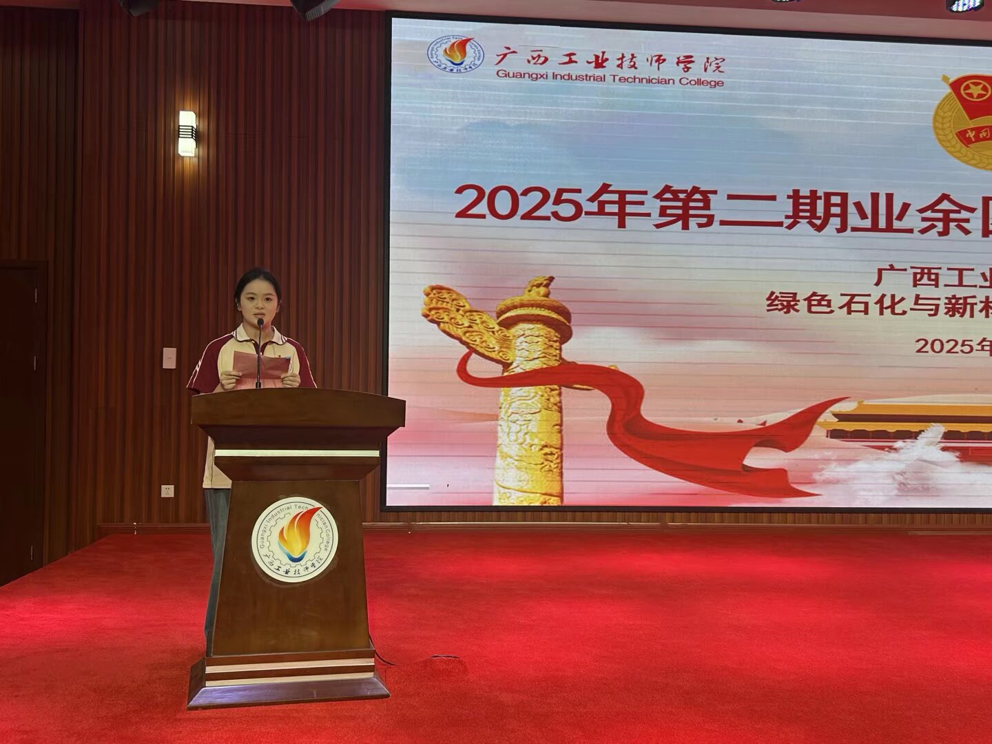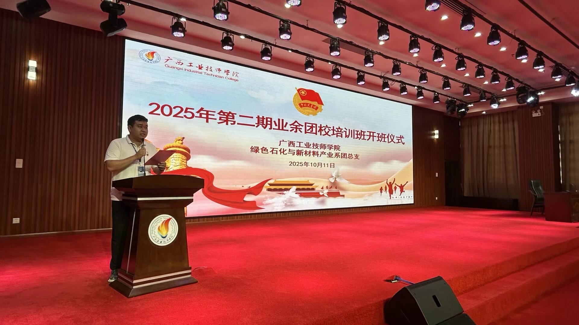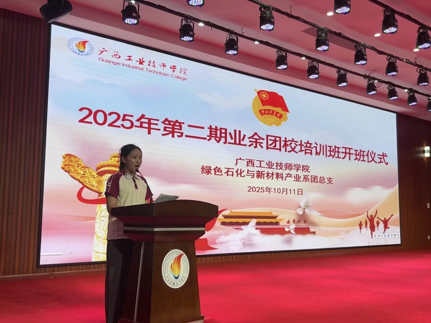 为进一步加强青年学生思想引领,培养有理想、有担当的共青团后备力量,2025年10月11日下午 16:30,广西工业技师学院 2025 年第二期业余团校绿色石化与新材料产业系分团校培训班开班仪式在学徒制大楼十楼报告厅隆重举行。绿色石化与新材料产业系党支部书记张美林、系团总支负责人赖昱辰、团总支干事及本期业余团校全体学员共同参会。