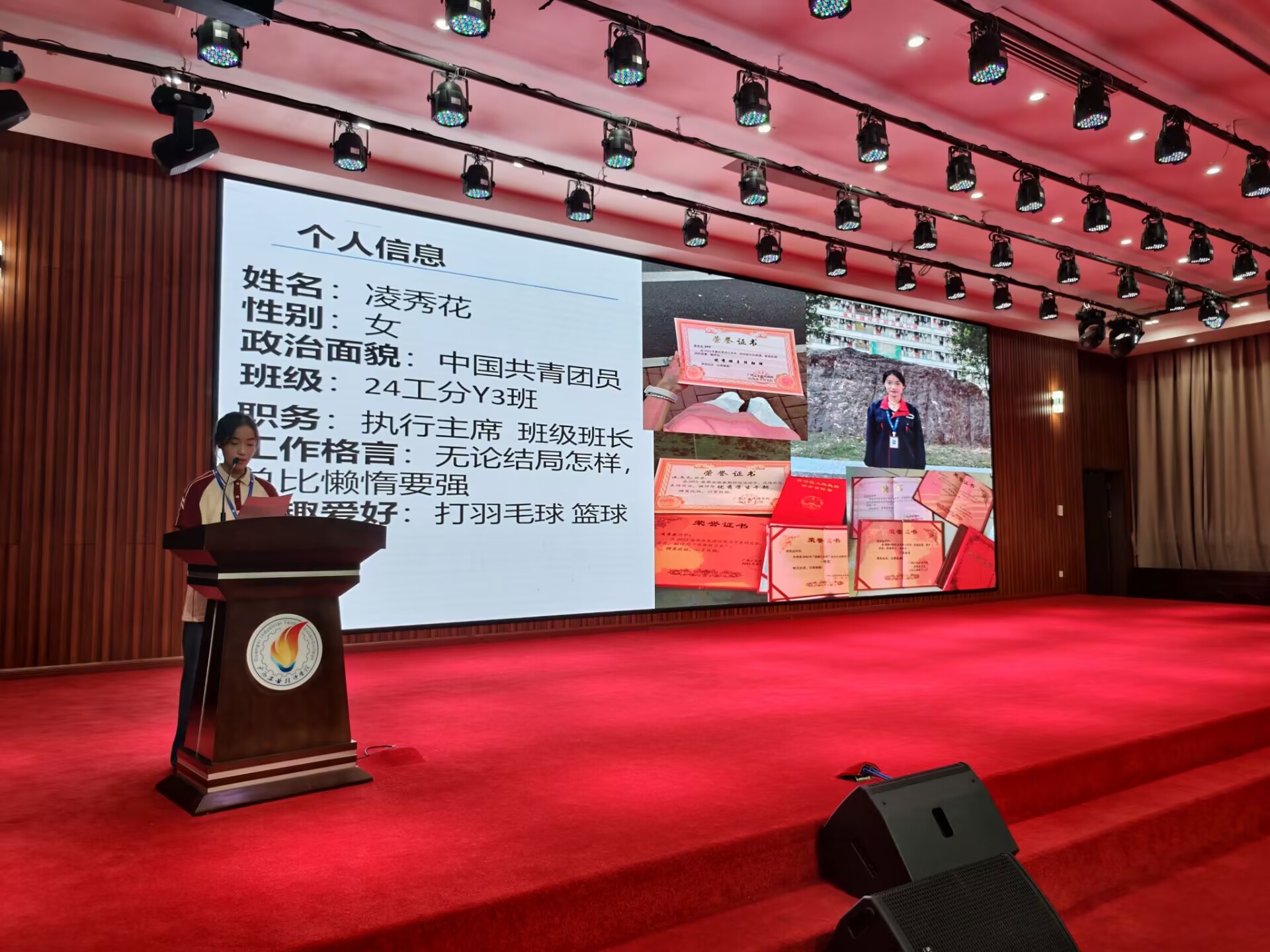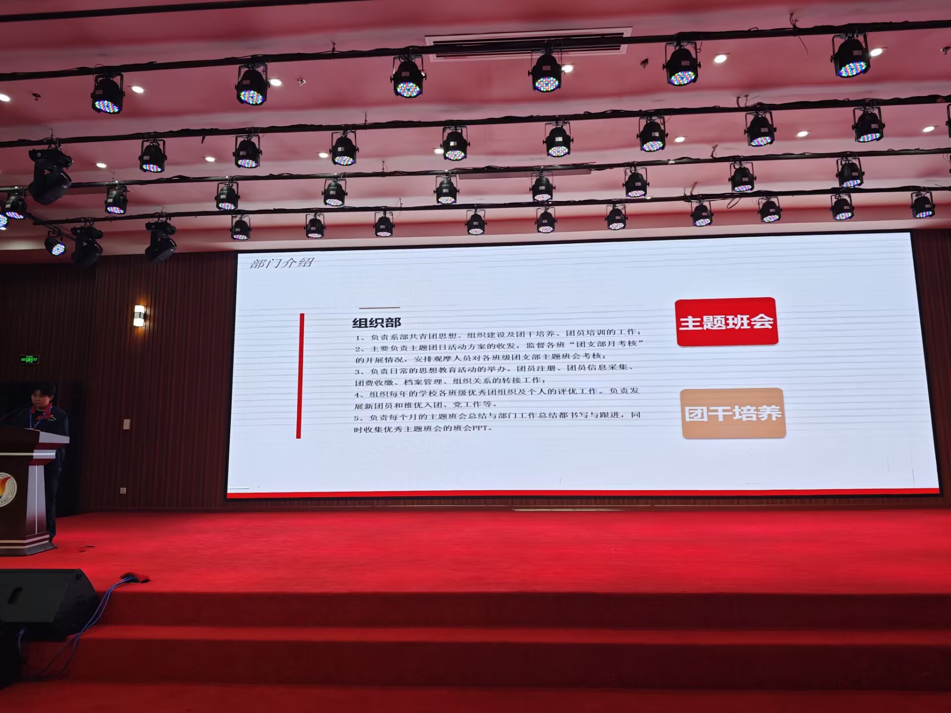 紧接着,团总支副书记钟芸、学生会主席凌秀花分别上台介绍各部门职责。钟芸围绕团总支各部门的核心工作,如思想引领、活动策划、志愿服务等内容展开说明;凌秀花则聚焦学生会各部门的服务职能与协作机制,进一步明确了各部门的工作职责与配合要点,为新学期工作有序推进奠定基础。