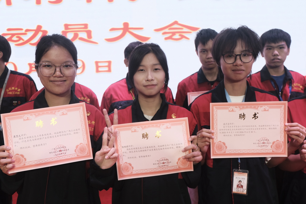 视频播放结束后,团总支负责人赖昱辰老师上台,详细介绍了本学期团总支学生会委员名单,让全体学生干部清晰了解组织架构。随后进入聘书颁发环节,在现场师生的见证下,嘉宾们依次为团总支、学生会委员及班主任助理颁发聘书,接过聘书的学生干部们面带笑容,既心情激动又展现出对这份职责的重视与担当。