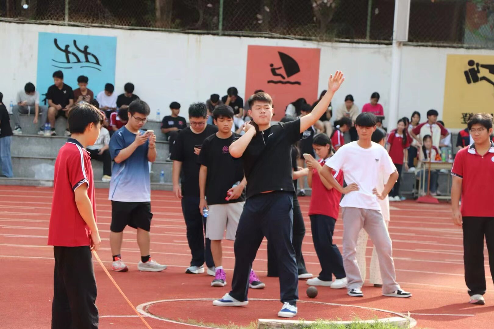 本次运动会设置了丰富多样的比赛项目。一分钟跳绳、一分钟仰卧起坐项目中,选手们屏气凝神,用灵活的动作展现着良好的身体素质,计数声与加油声交织成趣;跳高、跳远赛场上,运动员们助跑、起跳、落地,每一个动作都凝聚着力量与技巧,不断挑战着自我极限;铅球项目中,选手们沉稳发力,将铅球奋力掷出,划出一道道有力的弧线;短跑的爆发力与长跑的耐力比拼更是点燃了全场氛围,赛道上选手们挥汗奔跑,赛道旁师生们的呐喊助威声此起彼伏,将比赛气氛一次次推向高潮。