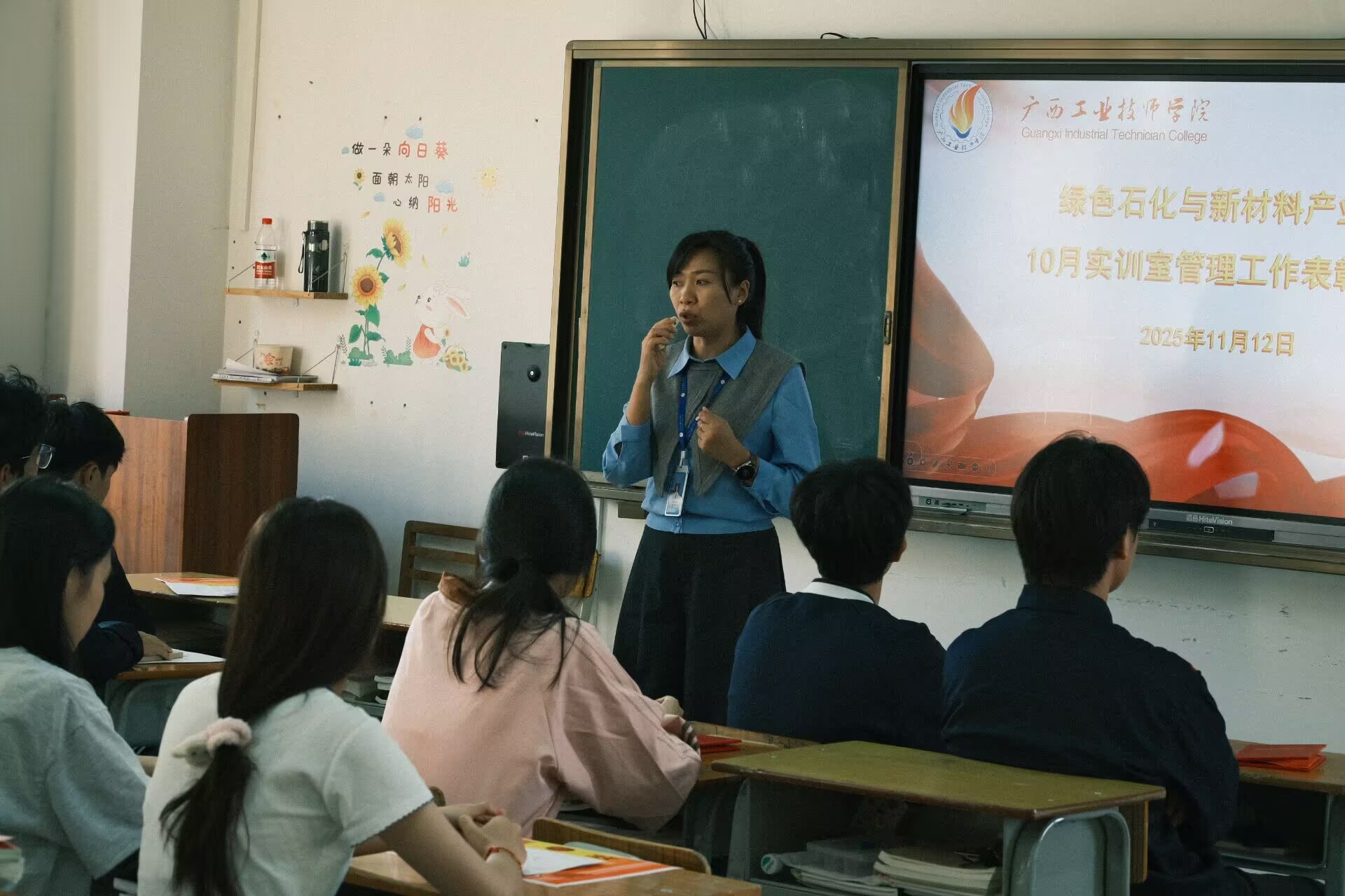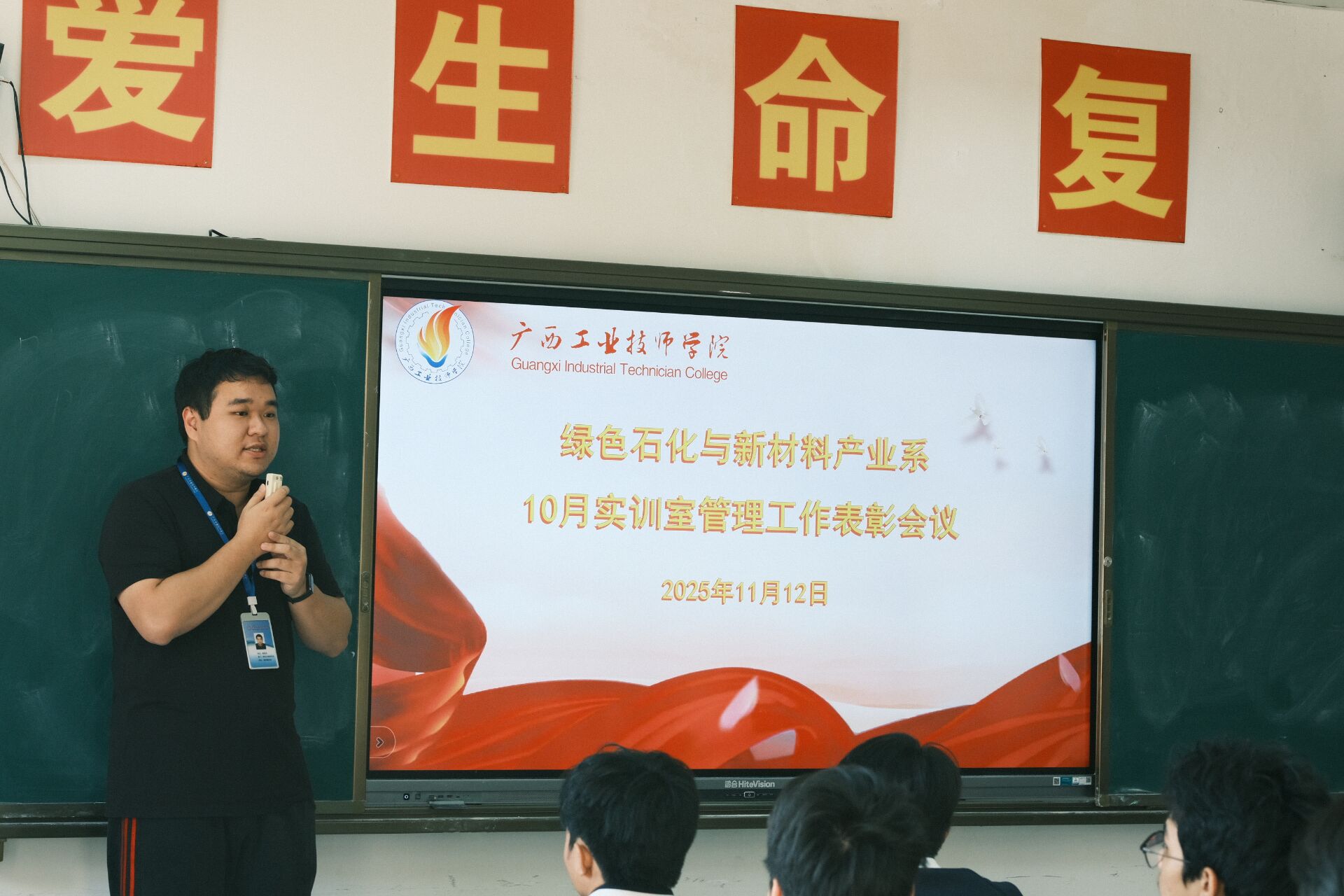 为树立管理标杆,强化实训育人保障,11月12日下午4:30,绿色石化与新材料产业系在石化大楼408教室隆重召开10月实训室管理工作表彰会。会议由系部辅导员赖老师主持,系部学务副主任唐双梅、系部辅导员黄秋明及全体实训室助理参会。