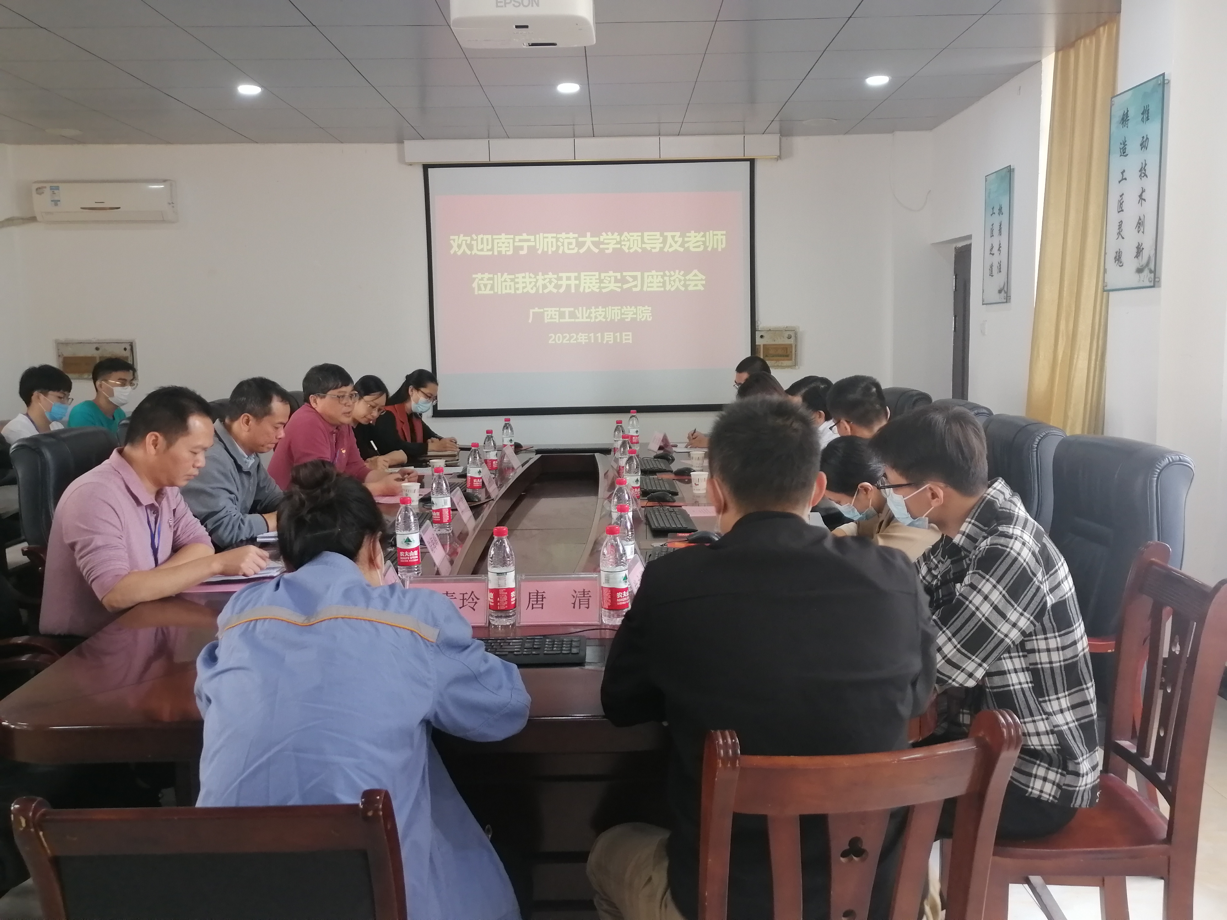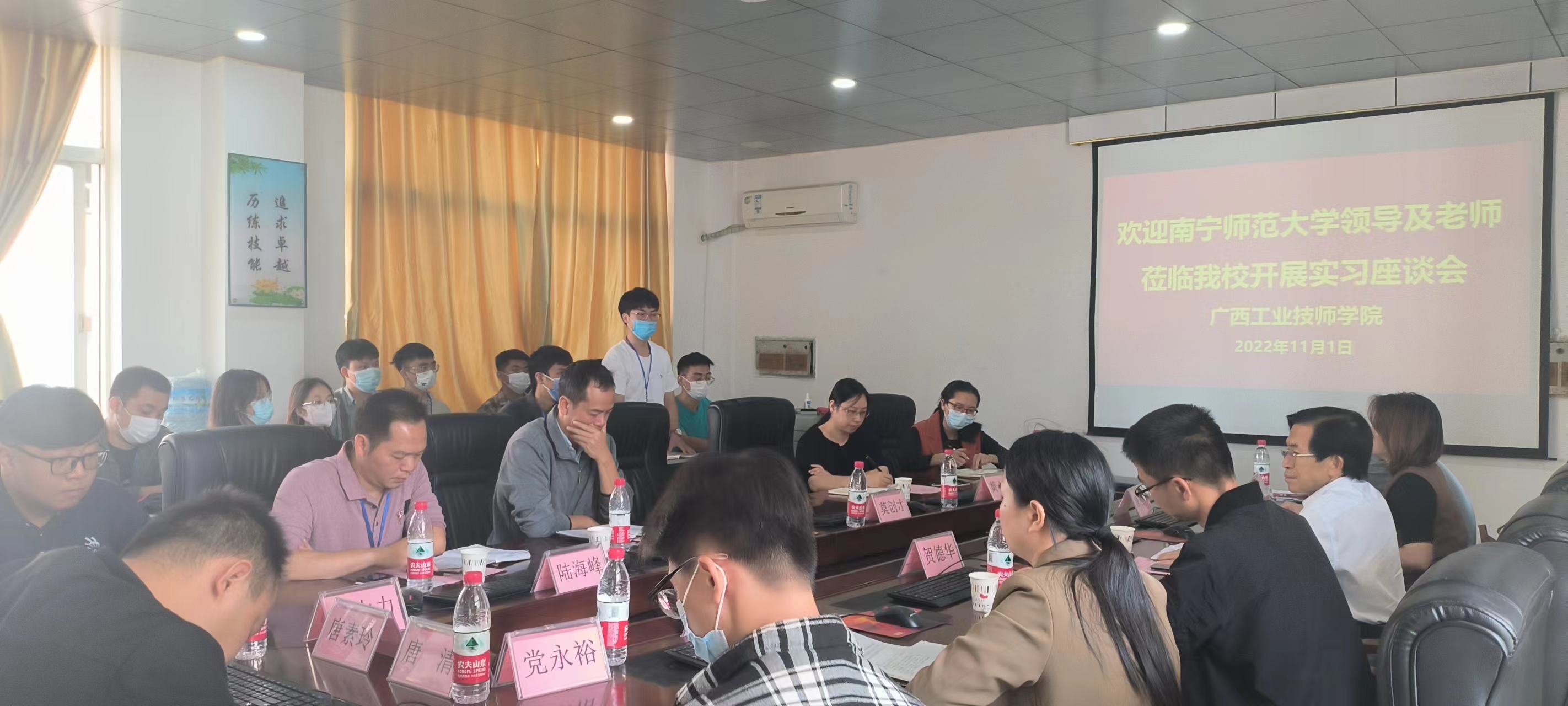 2022年11月1日上午,南宁师范大学(以下简称南师大)物电学院党委书记黄国华、自动化专业系主任贺德华、物电学院办公室主任唐丽莉等一行到我院参观学习,并组织在我院电气技术系进行教育教学实习的学生召开座谈会。参加本次座谈会的我院领导、教师有:党委副书记、院长莫创才,电气技术系主任庞广信,党支部副书记陆海峰,教务副主任黄小芹及带教教师代表等。