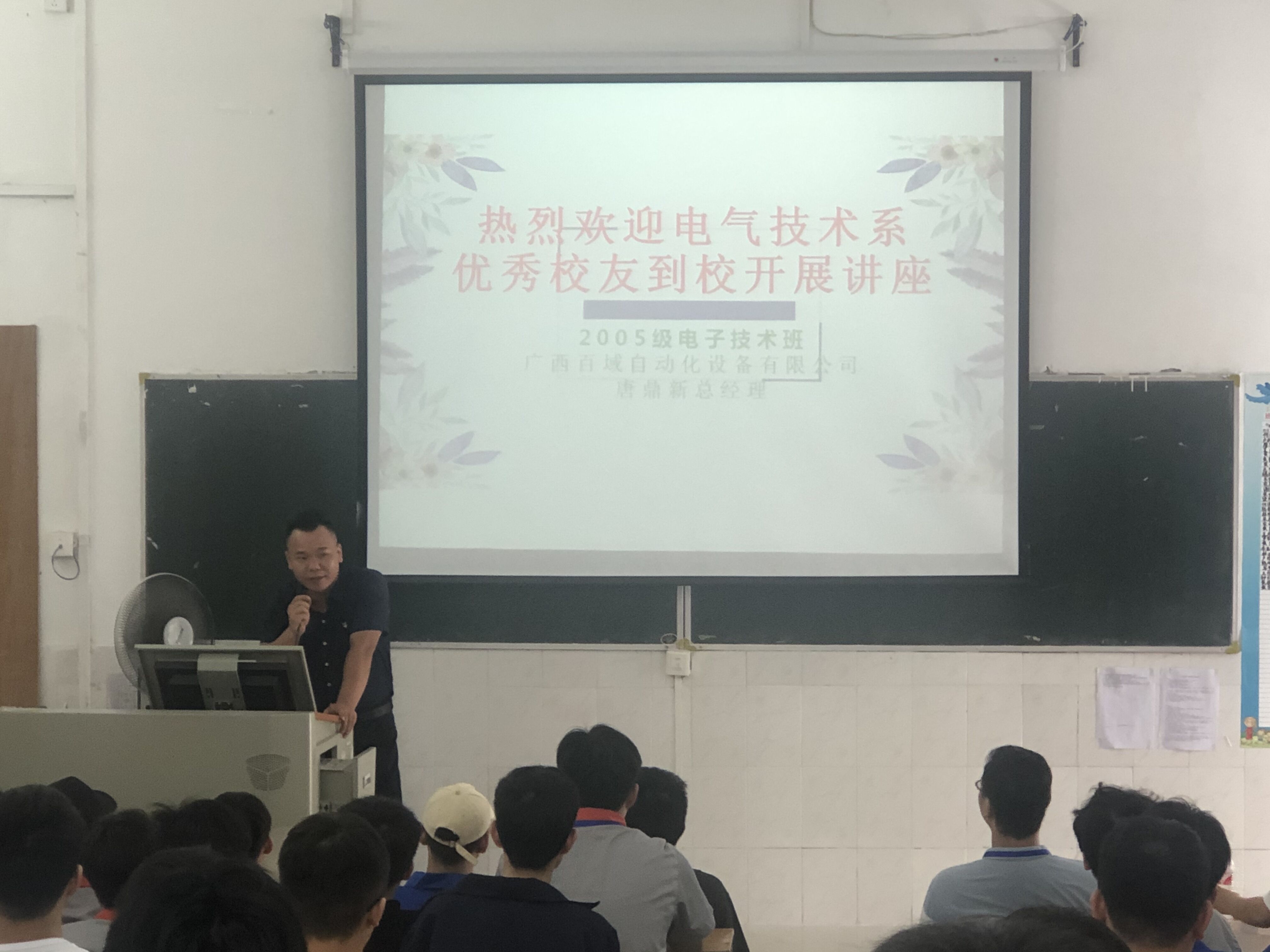 2021年6月1日,电气技术系在学院教学楼阶梯教室邀请了优秀毕业生代表广西百域自动化设备有限公司唐鼎新总经理为我系学生作报告。
