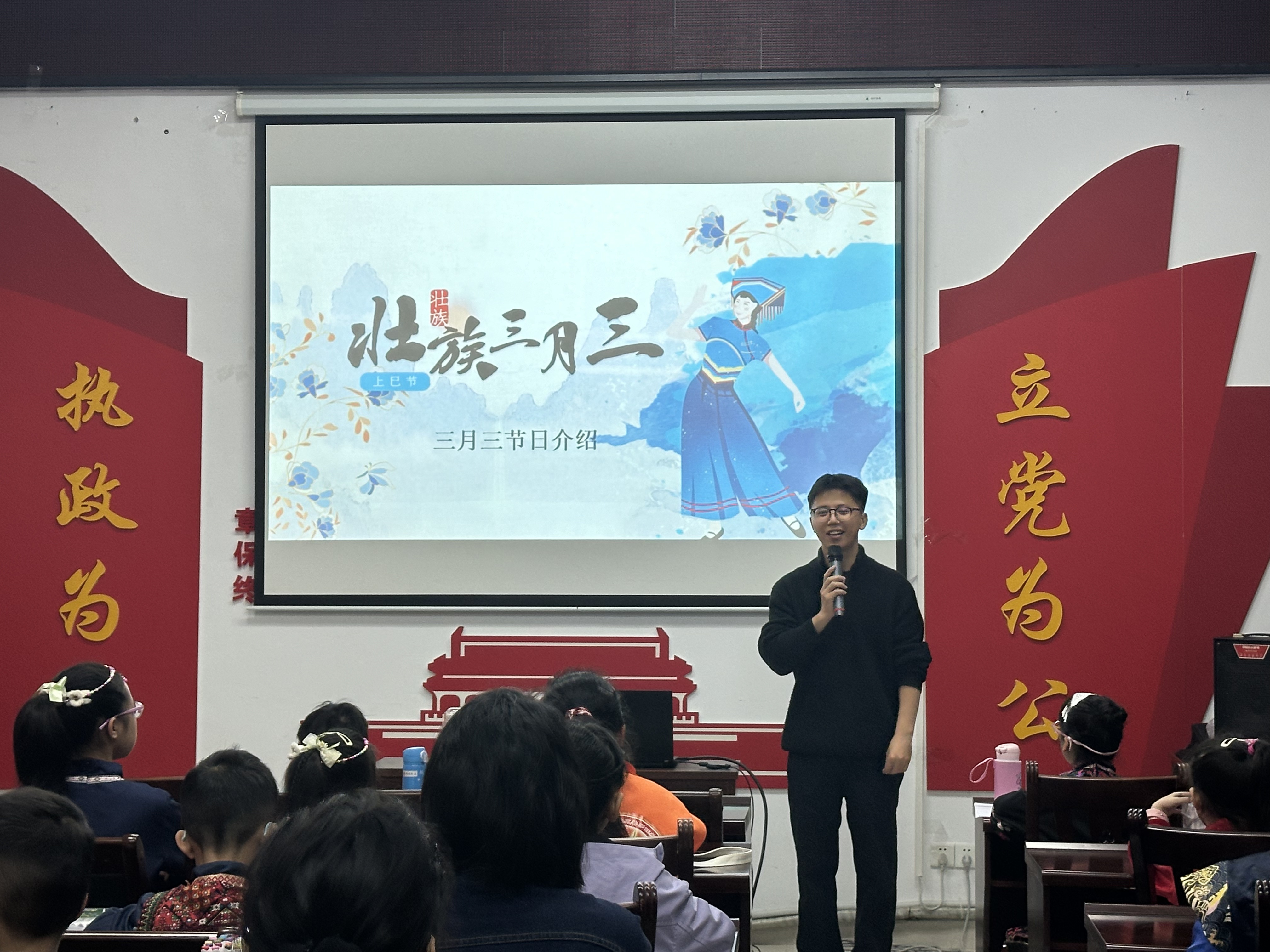 活动伊始,志愿者们化身“民族文化讲师”,通过多媒体课件与互动问答,生动讲述“三月三”的起源传说、五色糯米饭的吉祥寓意以及壮族歌圩文化的独特魅力。“原来绣球上的流苏代表十二个月份的祝福呀!”小朋友们惊叹于志愿者展示的壮锦纹样绣球,在寓教于乐中加深了对民族文化的认同感。