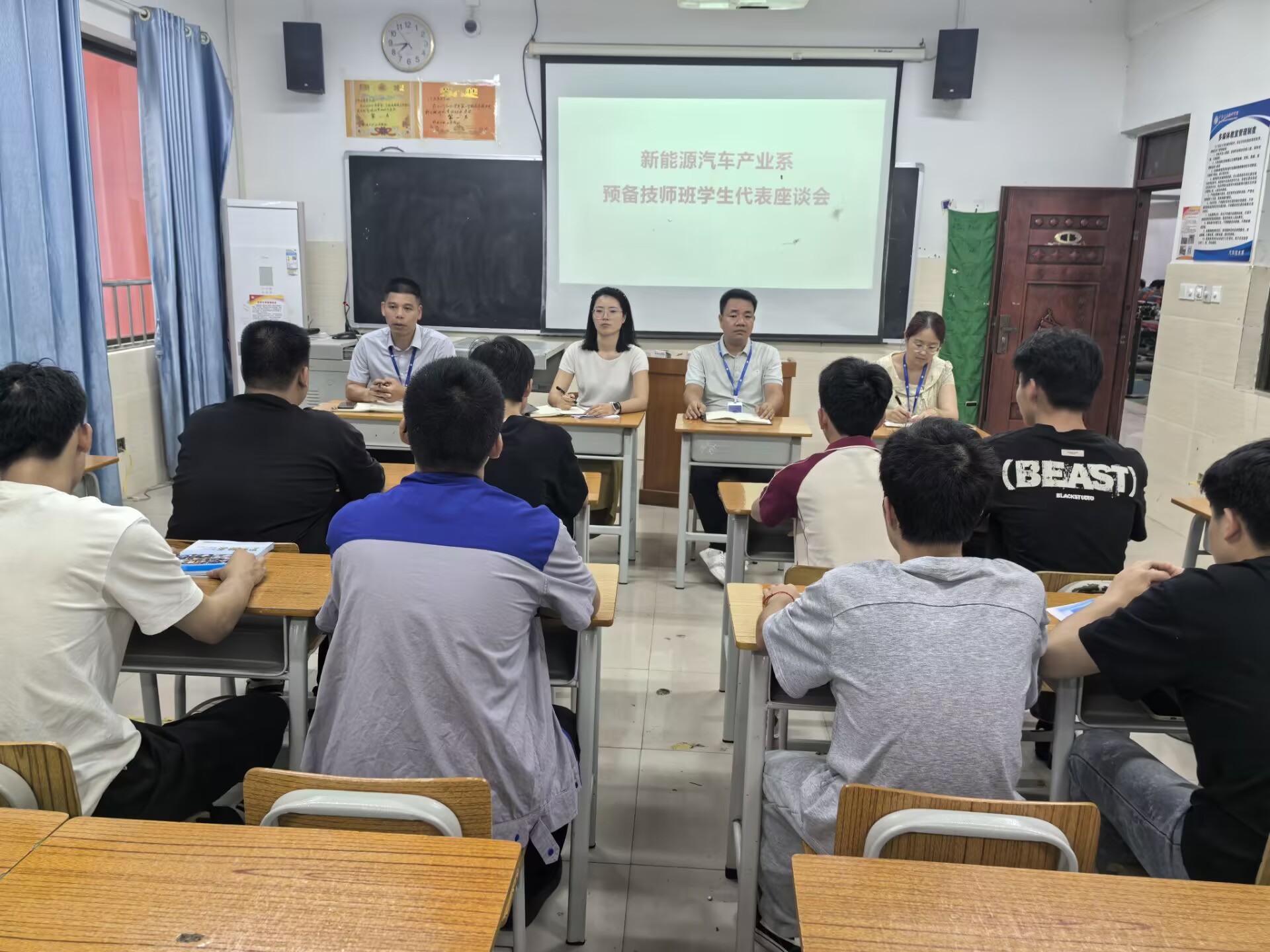 为深入了解学生诉求,进一步优化校园学习与生活环境,10月15日下午,新能源汽车产业系在实训楼302教室组织召开了2024级、2025级中职及高中起点预备技师班学生座谈会。会议聚焦宿舍管理、教学设施等学生普遍关心的问题,与学生代表进行面对面交流。系党支部书记陈大盛、学生科副科长邹黛、学务副主任黄光强、黄杏儿老师以及20余名学生代表共同参会。