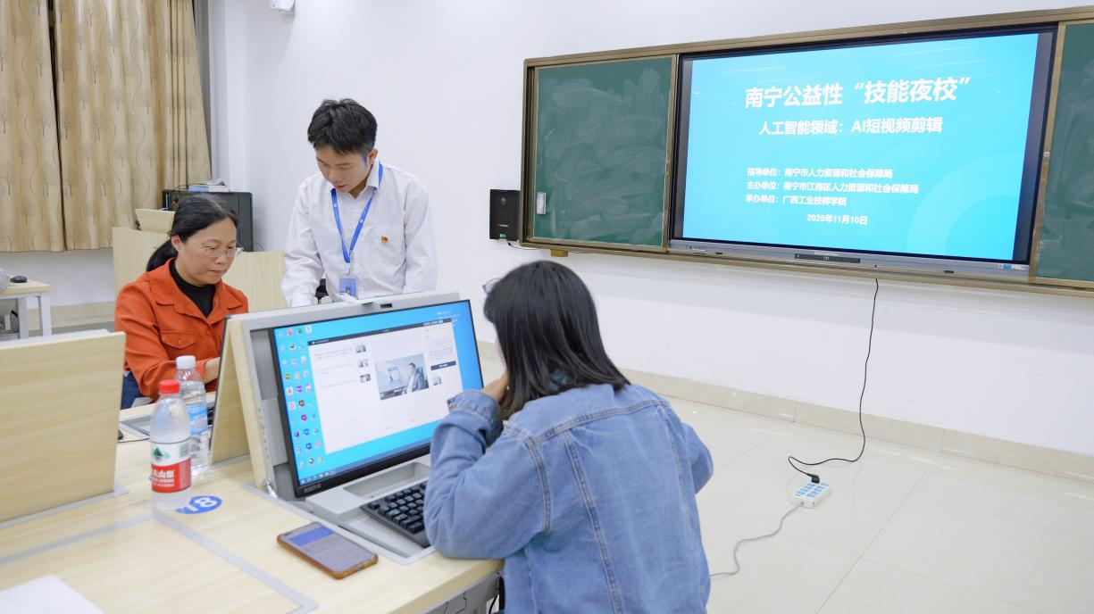 2025年11月10日晚,一堂别开生面的“AI短视频制作”课程在南宁公益“技能夜校”生动开展。本次课程由南宁市人力资源和社会保障局指导,江南区人力资源和社会保障局主办,广西工业技师学院承办,聚焦人工智能技术前沿,面向广大市民提供公益性技能提升服务,吸引了众多学员踊跃参与。