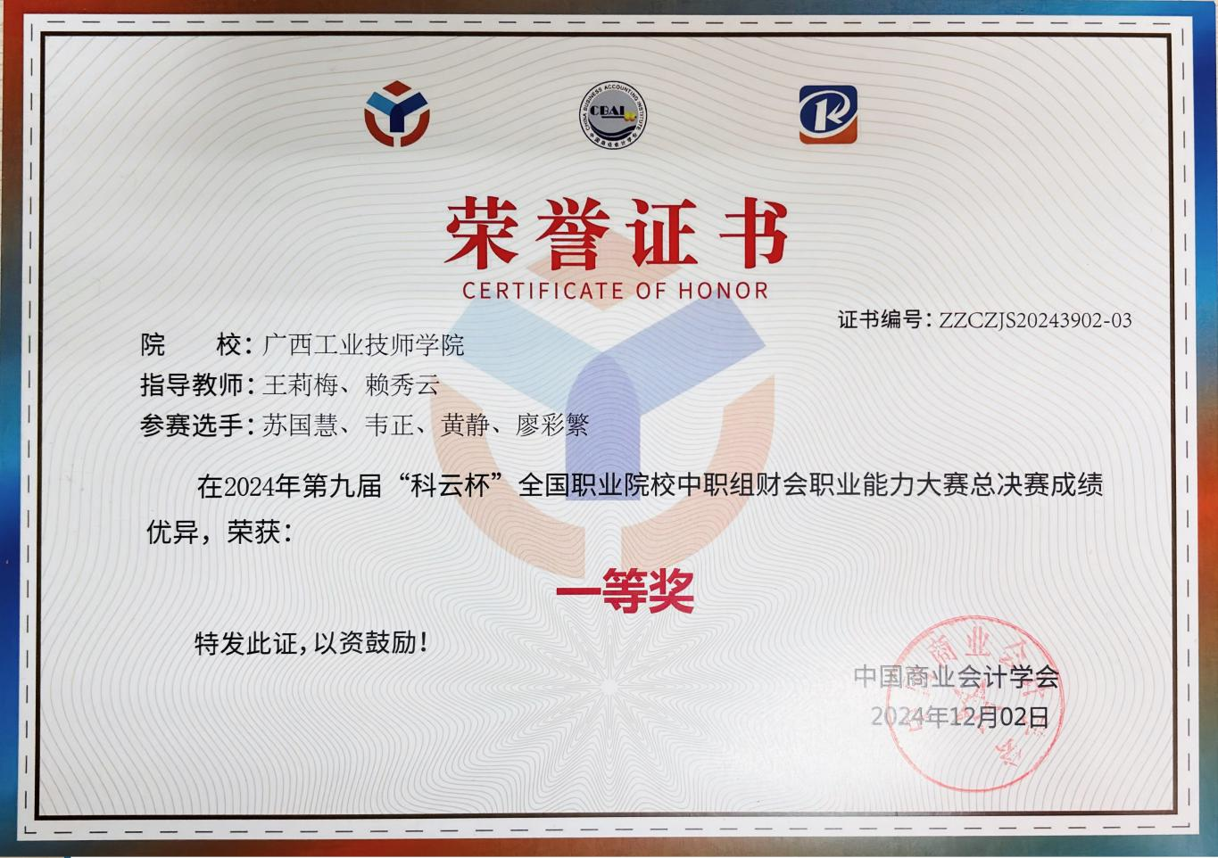 2024年第九届“科云杯”全国职业院校中职组财会职业能力大赛一等奖荣誉证书