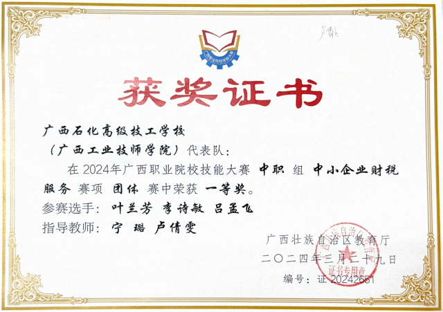 2024年广西职业院校技能大赛中职组《中小企业财税服务》赛项一等奖获奖证书