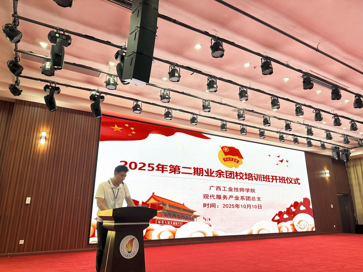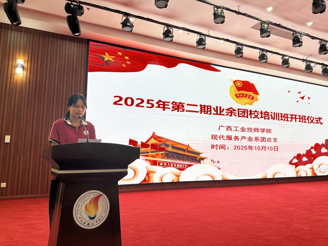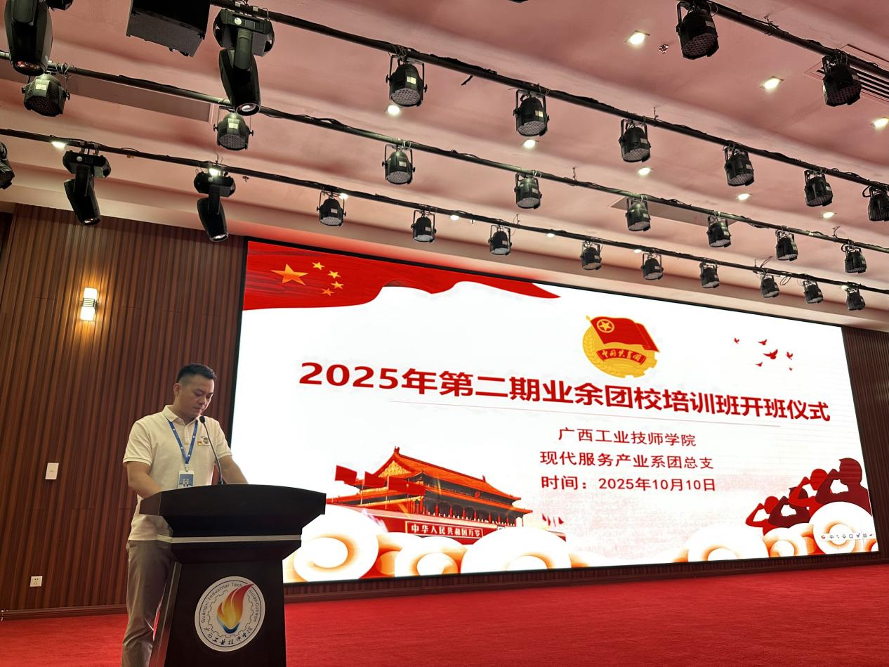 为深入学习贯彻习近平新时代中国特色社会主义思想,加强青年学生思想教育、团的基础建设和实践教育,巩固共青团组织根基,全面提高团员青年综合素质,10月10日下午,广西工业技师学院现代服务产业系举办2025年第二期业余团校培训班开班仪式。仪式由系团总支负责人谢智超主持,现代服务产业系副主任黄彬彬出席并讲话,142名培训班学员参加。