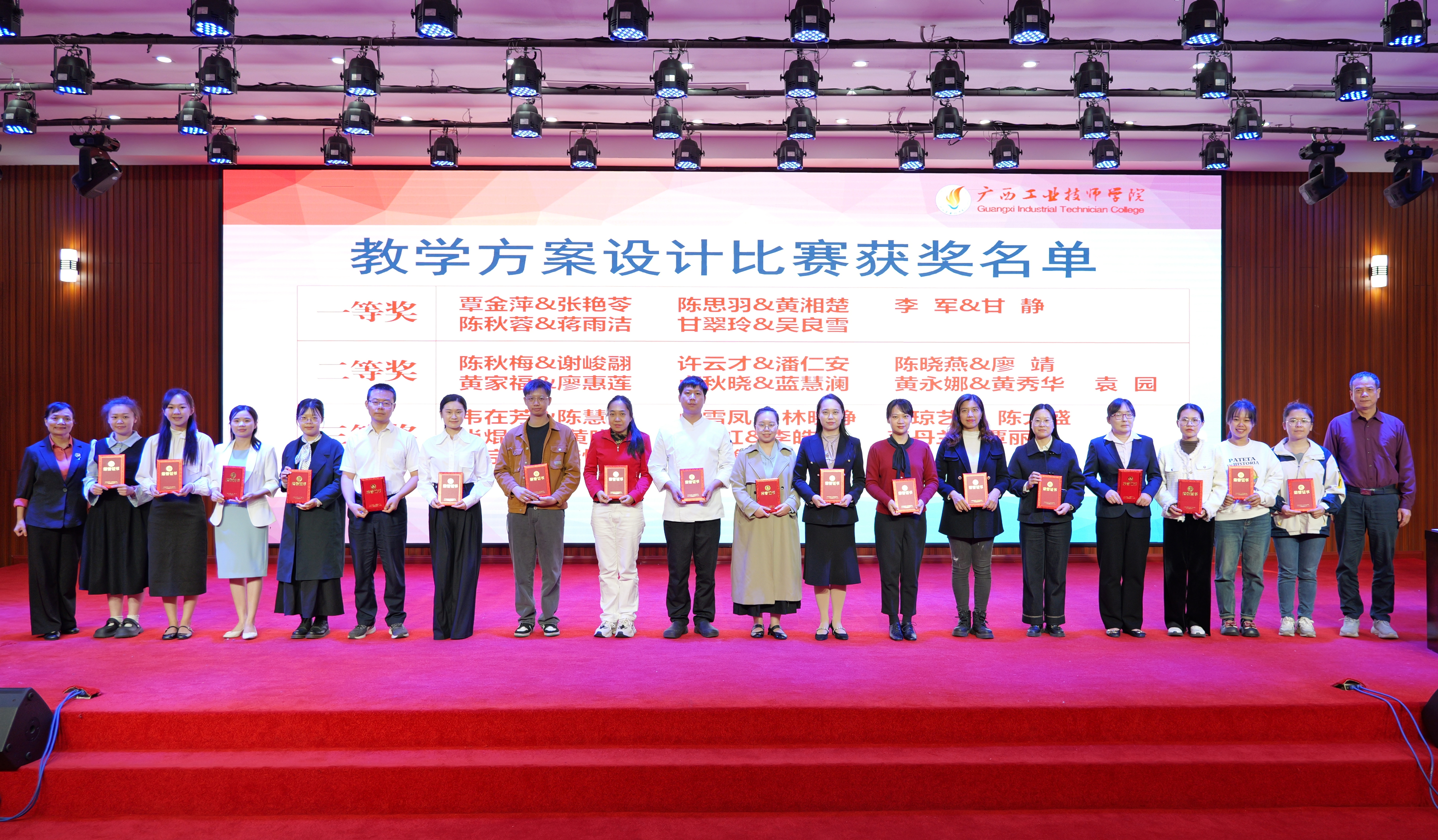 陈秋蓉(左3)与蒋雨洁(左2)团队、潘仁安(左10)与许云才团队、甘琼艺老师在教学方案设计比赛中分别荣获一等奖、二等奖、三等奖