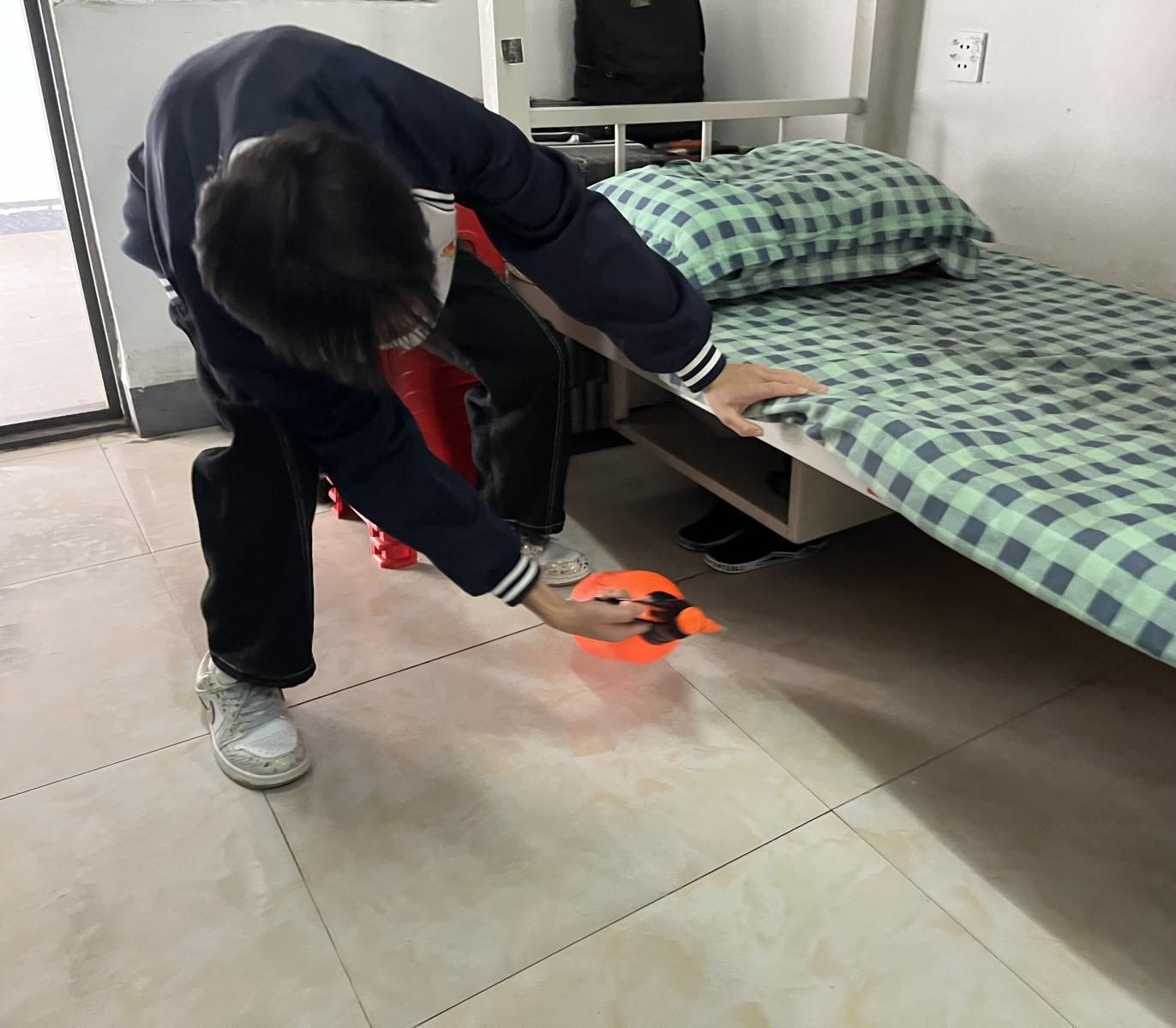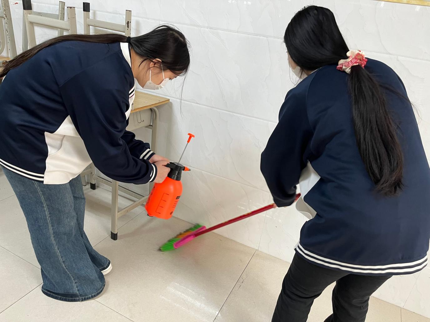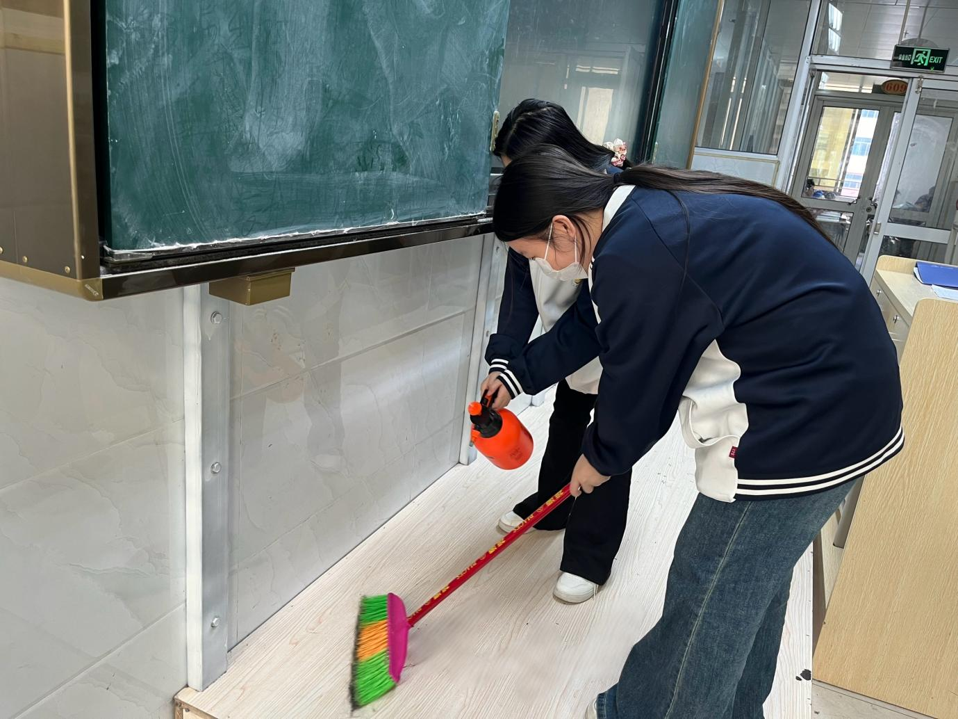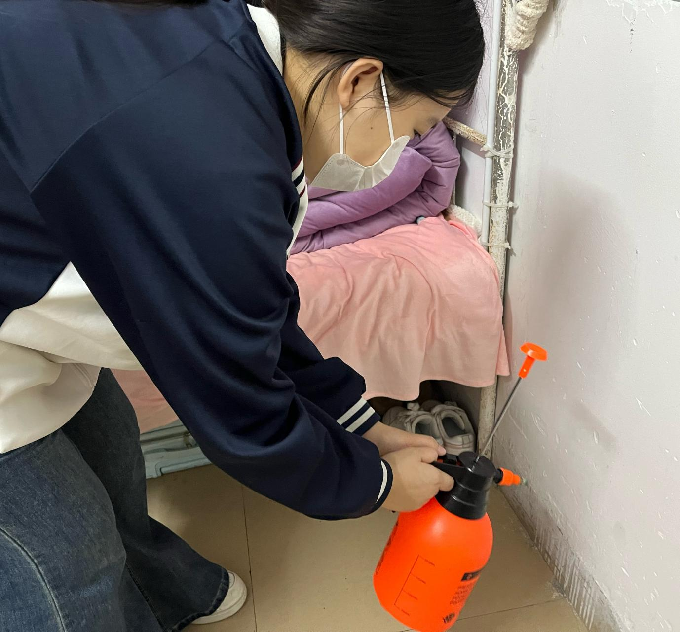 在充分动员的基础上,系部组织团总支、学生会干部及工作人员,在严格做好个人防护的前提下,对学生宿舍、教室、走廊、卫生间等公共区域进行系统消杀。尤其对门把手、桌椅、讲台、楼梯扶手等高频接触部位实施重点擦拭,并确保场所通风。消杀工作遵循“日常预防与重点强化相结合”的原则:对已出现流感样症状病例的宿舍增加消杀频次;教学区域实行课后消杀;遇有疑似聚集性病例或人员流动高峰,立即启动应急强化消杀机制,并对相关区域实施重点消毒,严格阻断病毒传播链。所有操作均严格按照标准配比消毒剂,规范执行,确保安全有效。