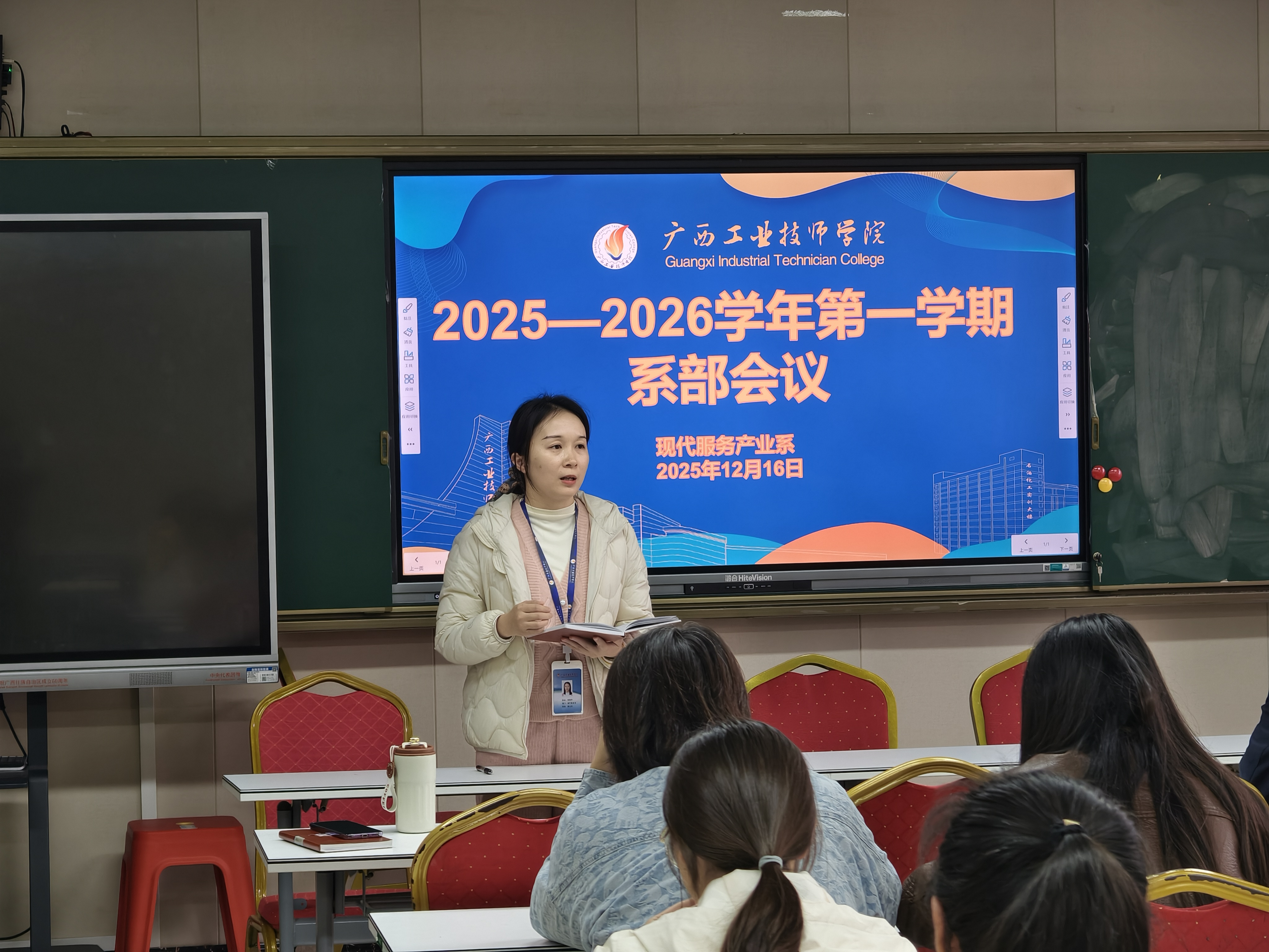 为深入学习贯彻党的二十届四中全会精神,扎实做好期末各项工作,12月16日下午,现代服务产业系组织召开全体教职工会议。会议聚焦“第一议题”学习,结合系部工作实际,全面部署期末任务,为本学期工作圆满收官奠定基础。