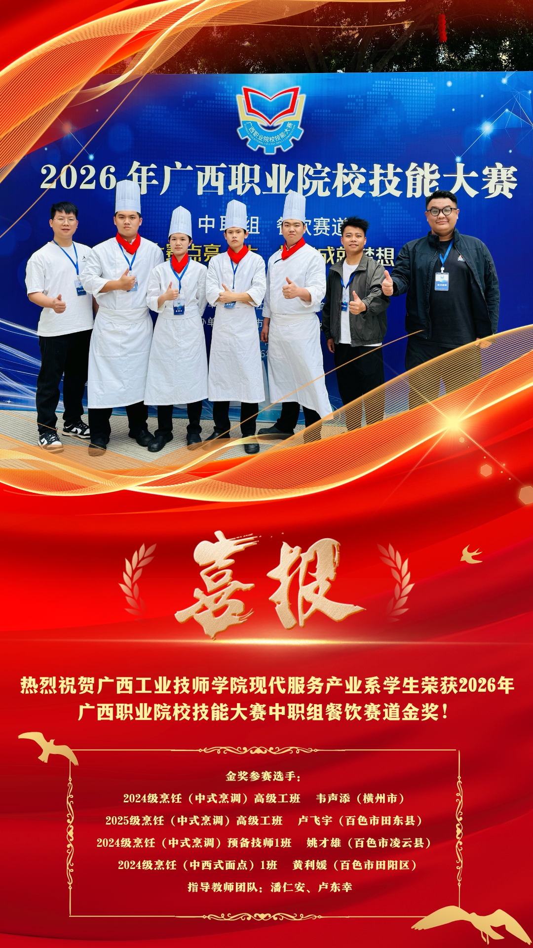 【系部新闻】喜讯:热烈祝贺广西工业技师学院现代服务产业系学生荣获2026年广西职业院校技能大赛中职组《餐饮赛道》1金1铜