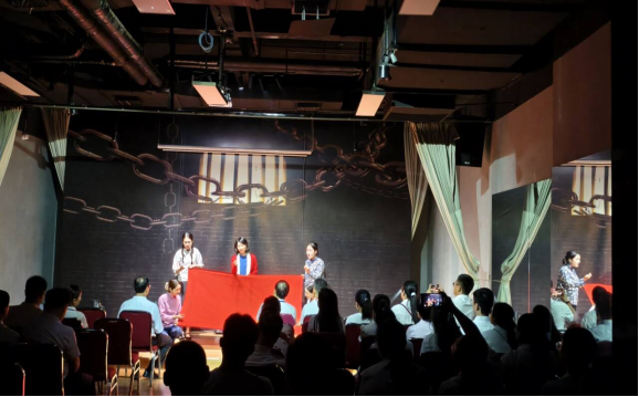 沉浸式课堂首先以演员们包含深情的朗诵开场,一首《爱我中华》的歌曲演唱瞬间点燃全场爱国情怀。接着,在学院党委书记、院长莫创才的带领下,通教中心全体党员教师现场聆听壮族歌曲表演,熟悉的乡音传递着壮乡儿女对党的赤诚之心,也让党员教师们深切体会中华民族共同体的深厚根基。紧接着,演员们通过还原“五四运动”历史场景,逼真呈现青年学生高举标语游行呐喊“外争主权,内除国贼”的震撼画面,让党员教师们仿佛置身1919年的街头,亲历觉醒年代的热血与激昂。在“红船启航”表演中,当“全世界无产者联合起来”的呐喊响起时,在场人人无不为“开天辟地、敢为人先”的初心所触动。“江姐”主题表演将活动推向情感高潮,当由演员饰演的革命烈士江竹筠在生命的最后时刻高喊“共产党员的意志是钢铁”时,全场寂静无声,也让党员教师们深刻感受到了革命先烈以生命捍卫信仰的钢铁意志。