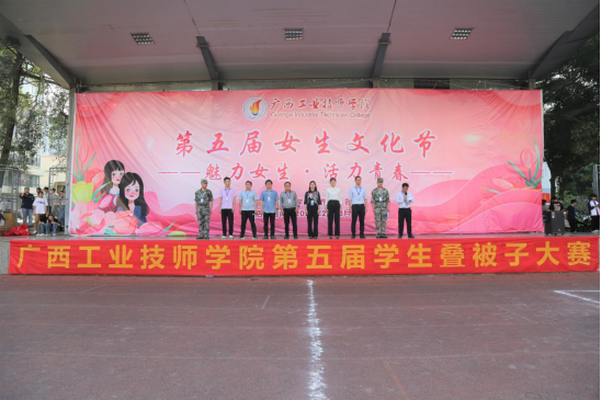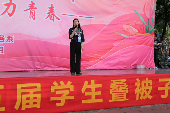 △学院副院长王晓萍宣布广西工业技师学院第五届学生叠被子大赛开赛
