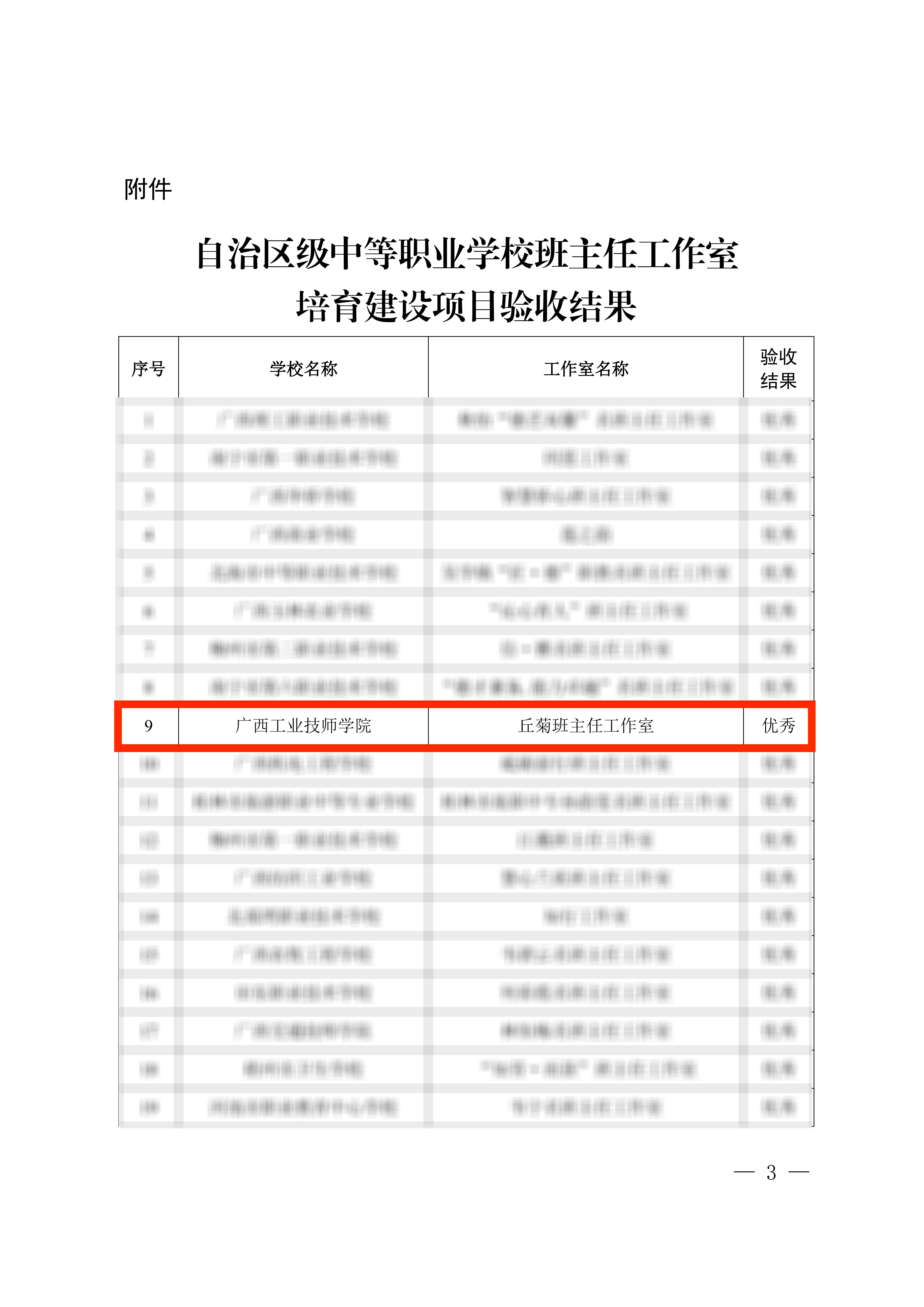 近日,广西壮族自治区教育厅下发了《自治区教育厅关于公布自治区级中等职业学校班主任工作室培育建设项目验收结果的通知》。我院丘菊班主任工作室通过验收,验收结果获得优秀。