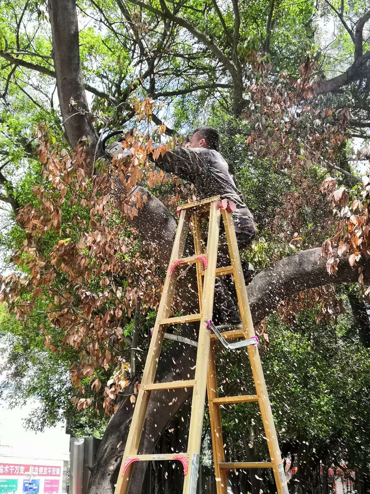 我院校园内种植的各类树木繁多,一些树木生长多年,日趋粗壮、枝叶繁茂。现正值入夏,雨季逐渐增多,为保持校园绿化环境的美观与排除安全隐患,避免安全事故的发生,后勤科近日对校园内的树木进行全面检查,将伸展过长,影响建筑物及通行安全的枝干进行割据,对有断枝隐患的枯枝进行拉剪修据。